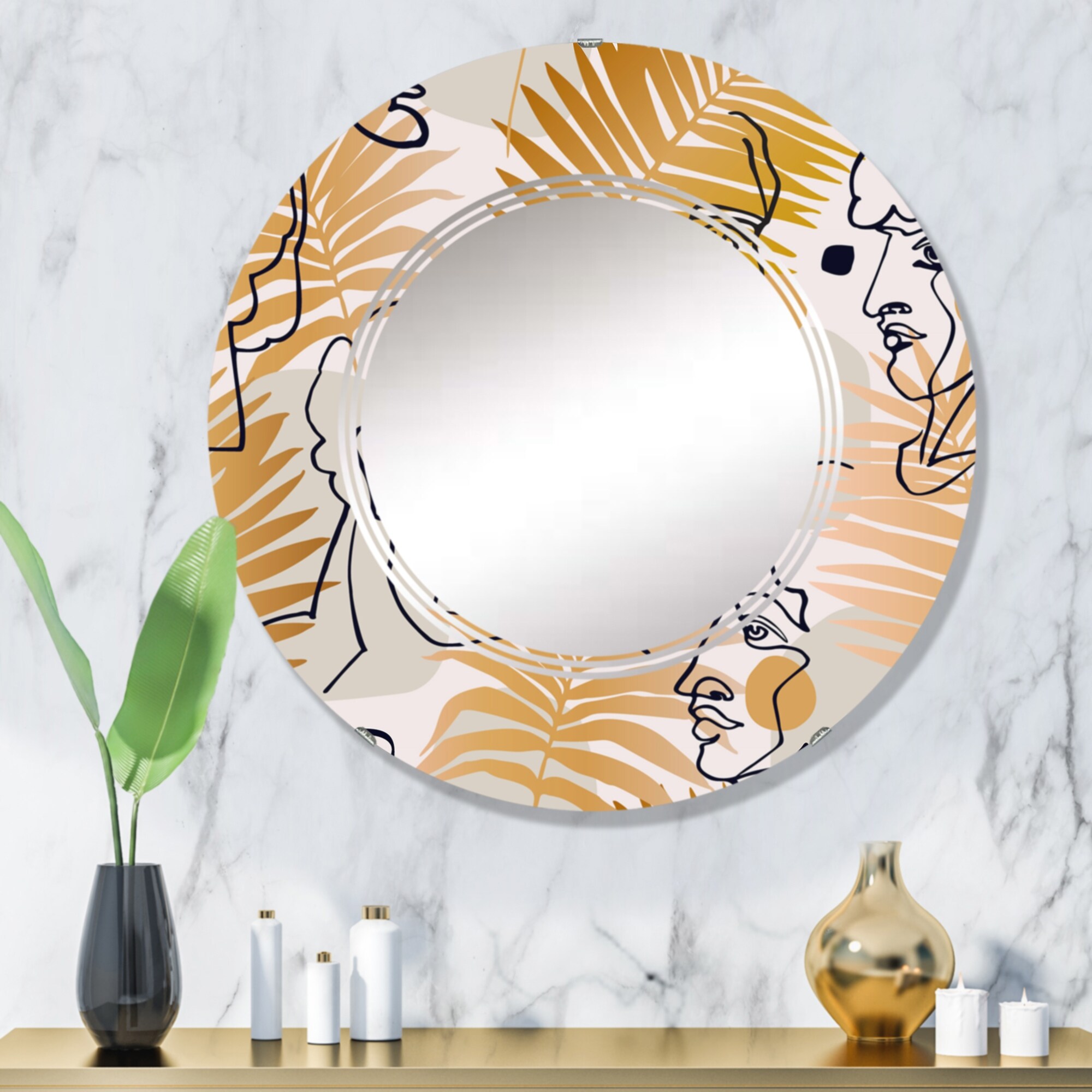 Designart 'One Line Art Portrait With Tropical Leaves' Printed Vintage Wall Mirror