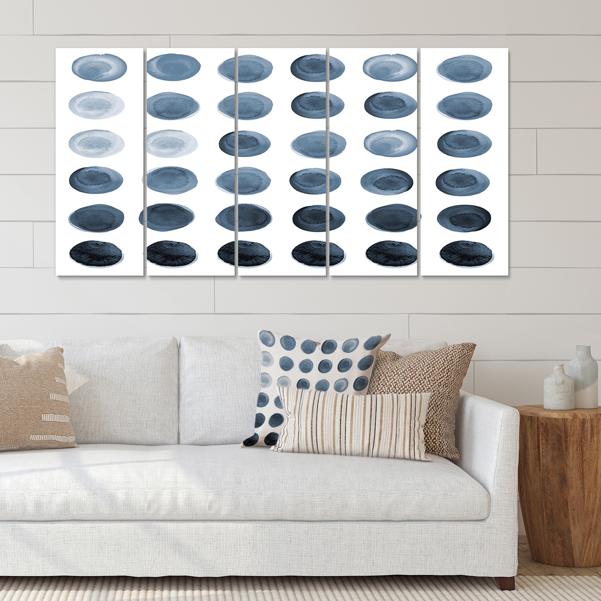 Designart "Circle Grid in Shades of Grey" Modern Canvas Wall Art Print - 60x32 - 5 Panels