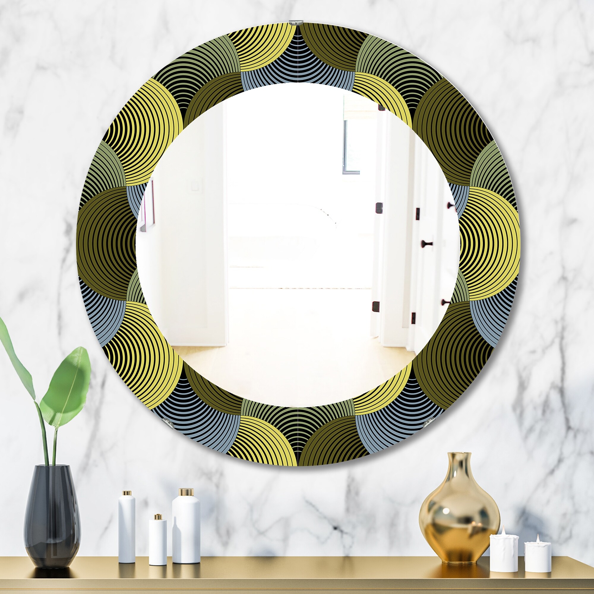 Designart 'Retro Geometric Grid IV' Printed Modern Round or Oval Wall Mirror - Leaves