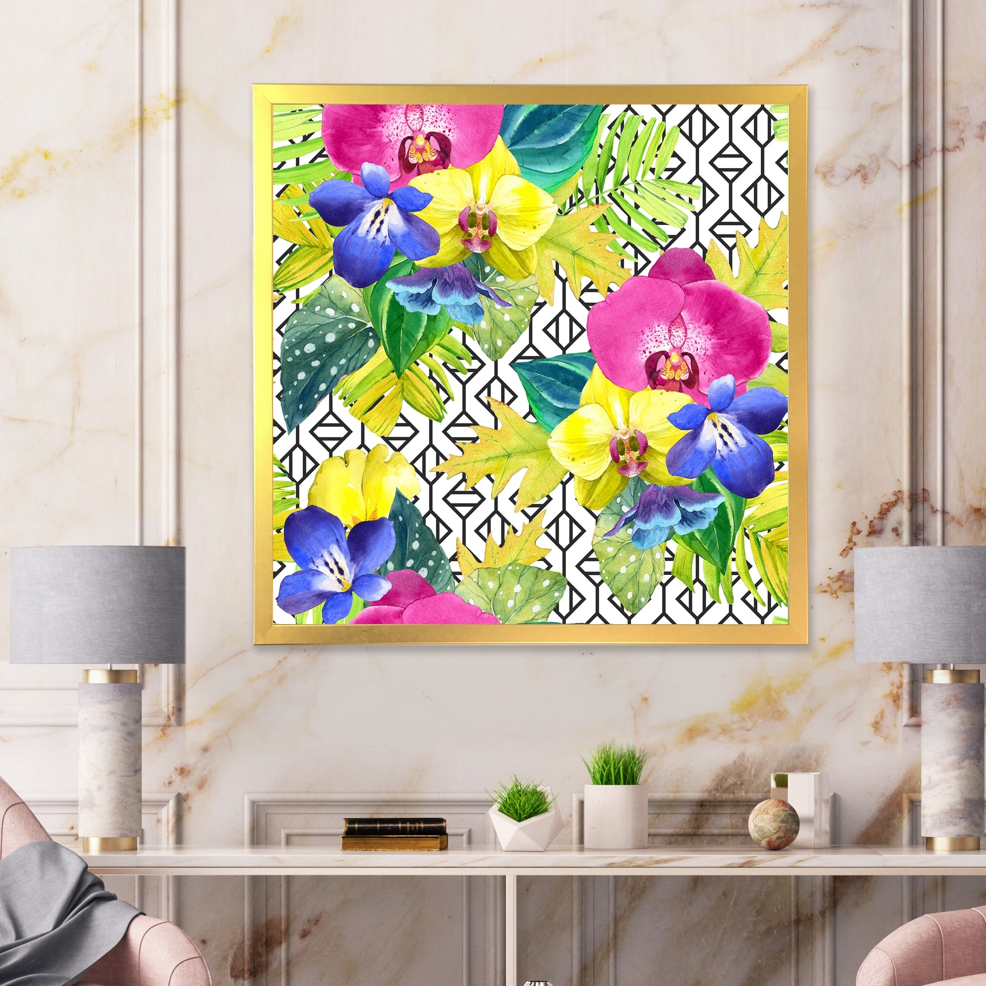 Designart "Yellow Blue And Fuchia Orchids on Organic Grid" Tropical Framed Canvas Wall Art Print