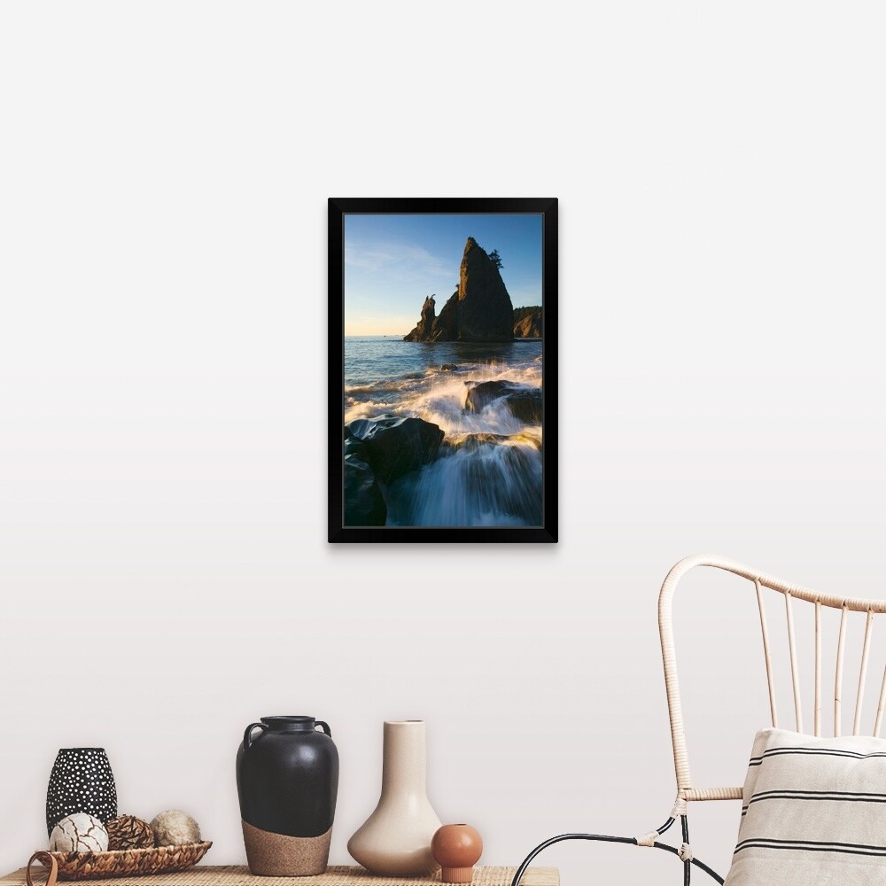 "Sea stack and ocean surf on rocky Rialto Beach, Olympic National Park, Washington" Black Framed Print