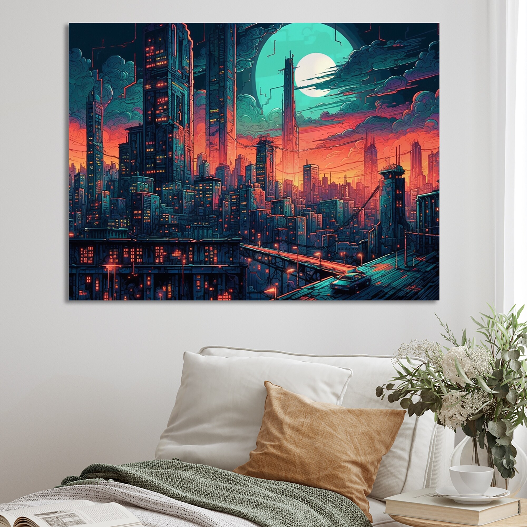 Designart "Green And Orange Metropolis Deco Ii" City Art Deco Canvas Prints