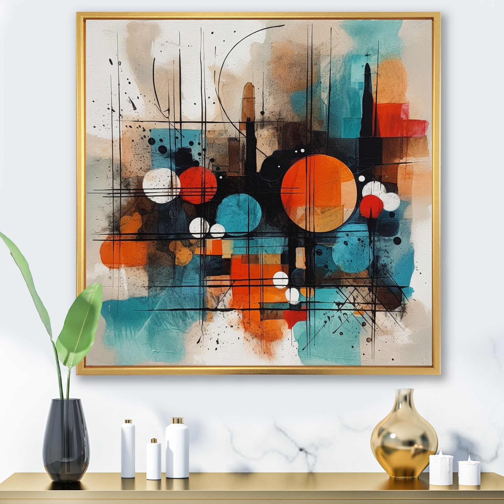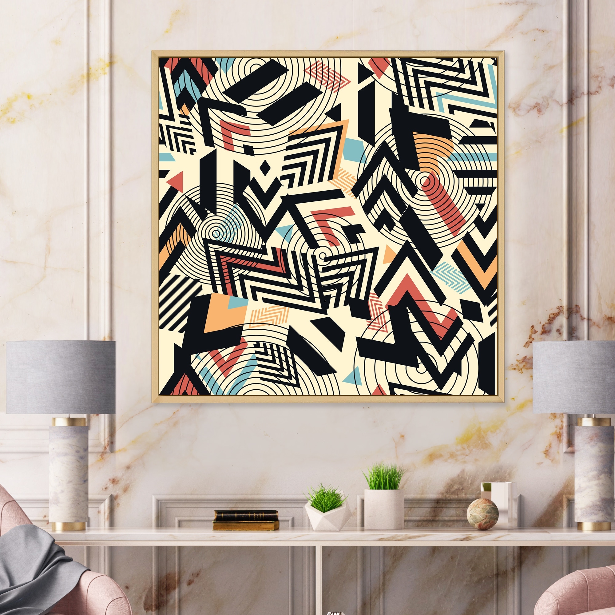 Designart "Retro Geometrics in Blue Orange And Black" Patterned Framed Canvas Wall Art Print