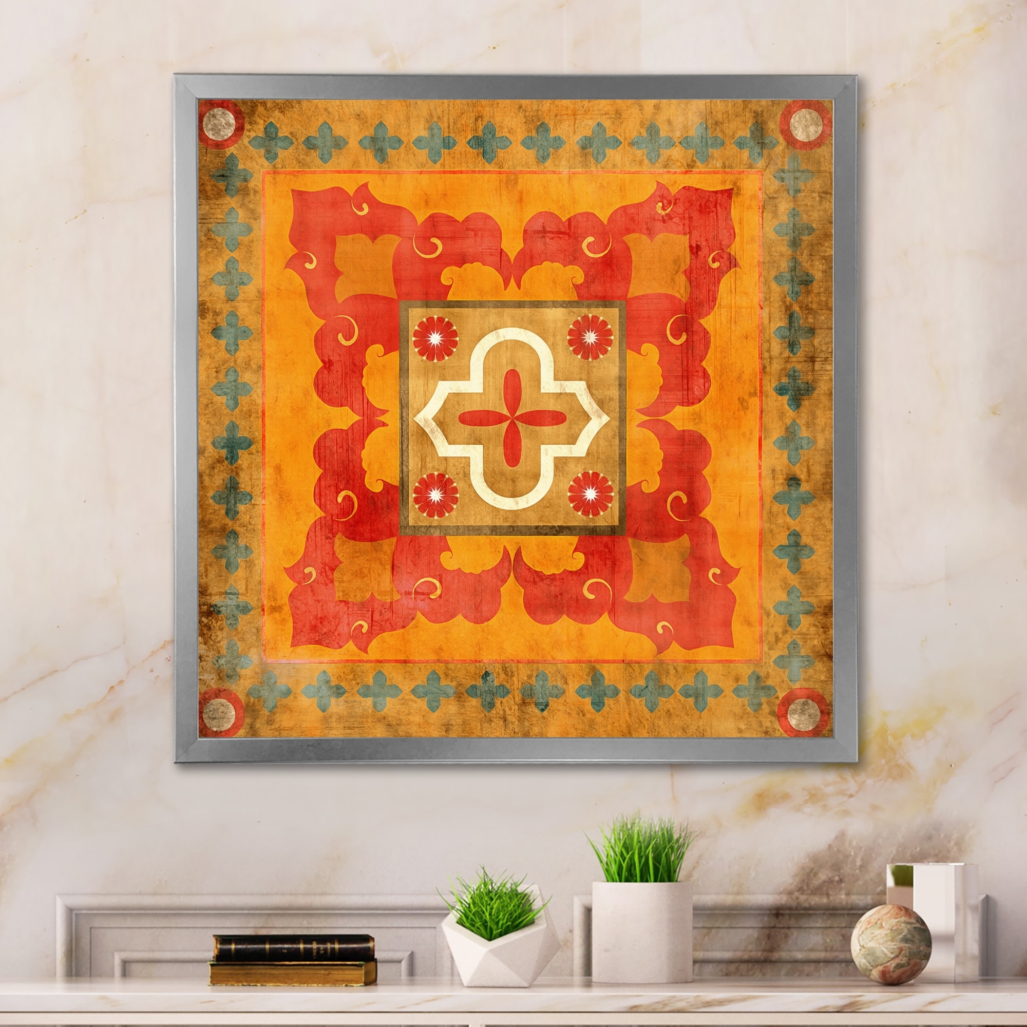 Designart "Moroccan Orange Tiles Collage II" Bohemian Chic Framed Art Print