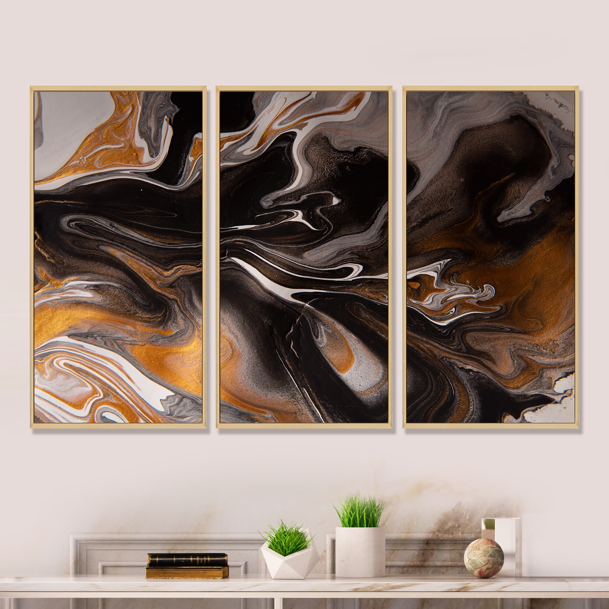Designart "Orange And Black Marble Waves II" Modern Framed Wall Decor Set of 3 - 4 Colors of Frames