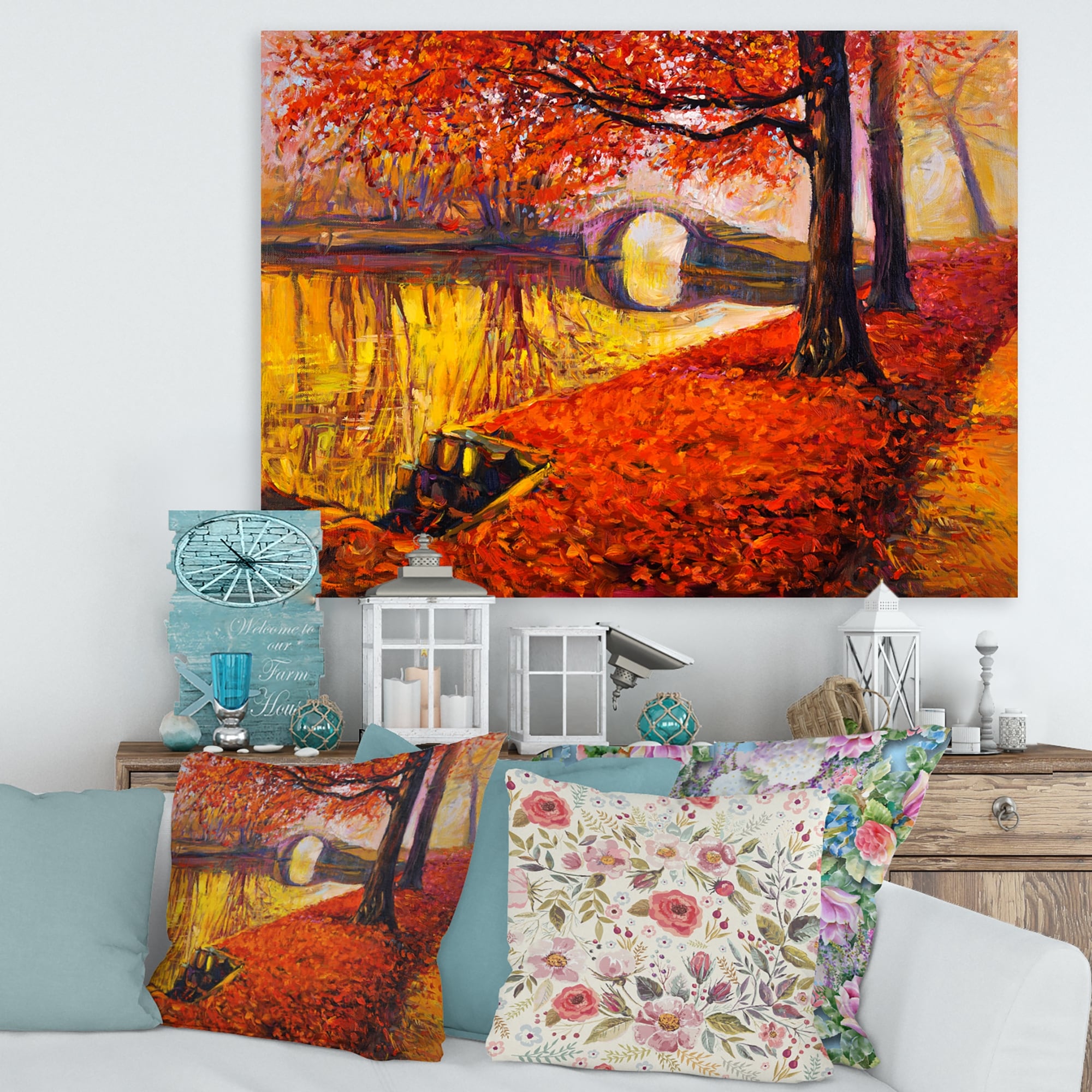 Designart "Little Bridge in Orange Autumn Landscape I" Traditional Canvas Wall Art Print
