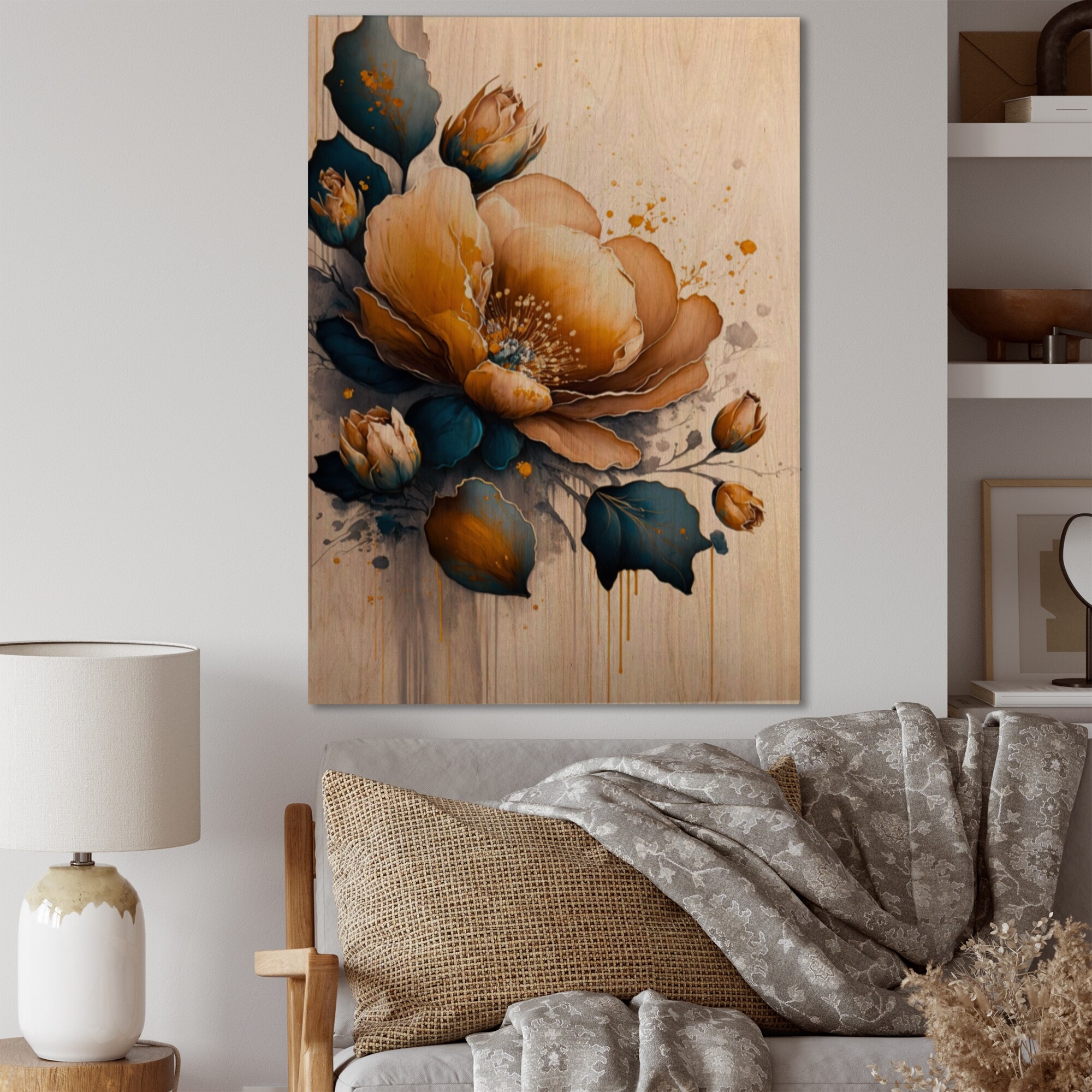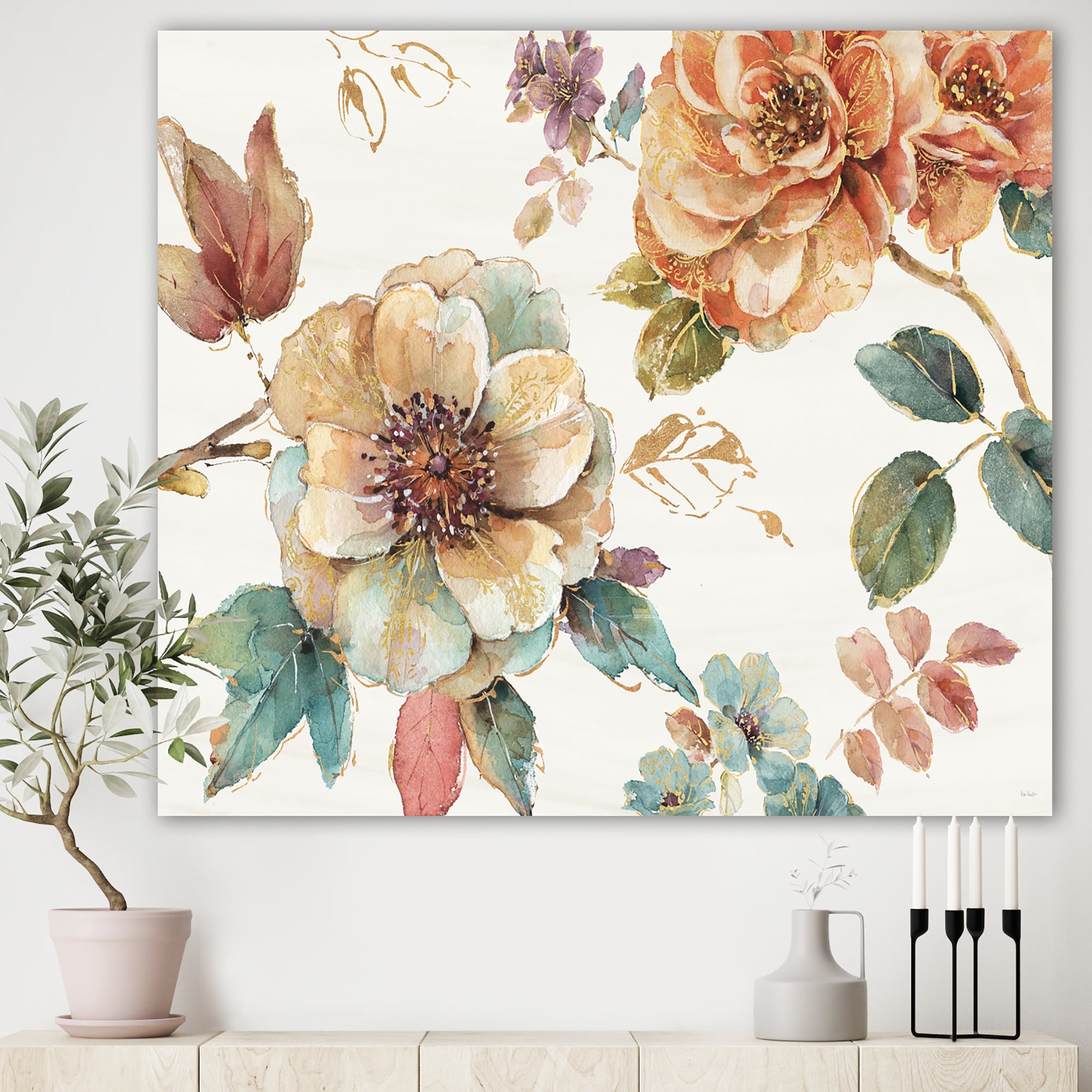Designart "Orange and Cream Cottage Flowers Twig" Traditional Canvas Artwork Print - Multi-color