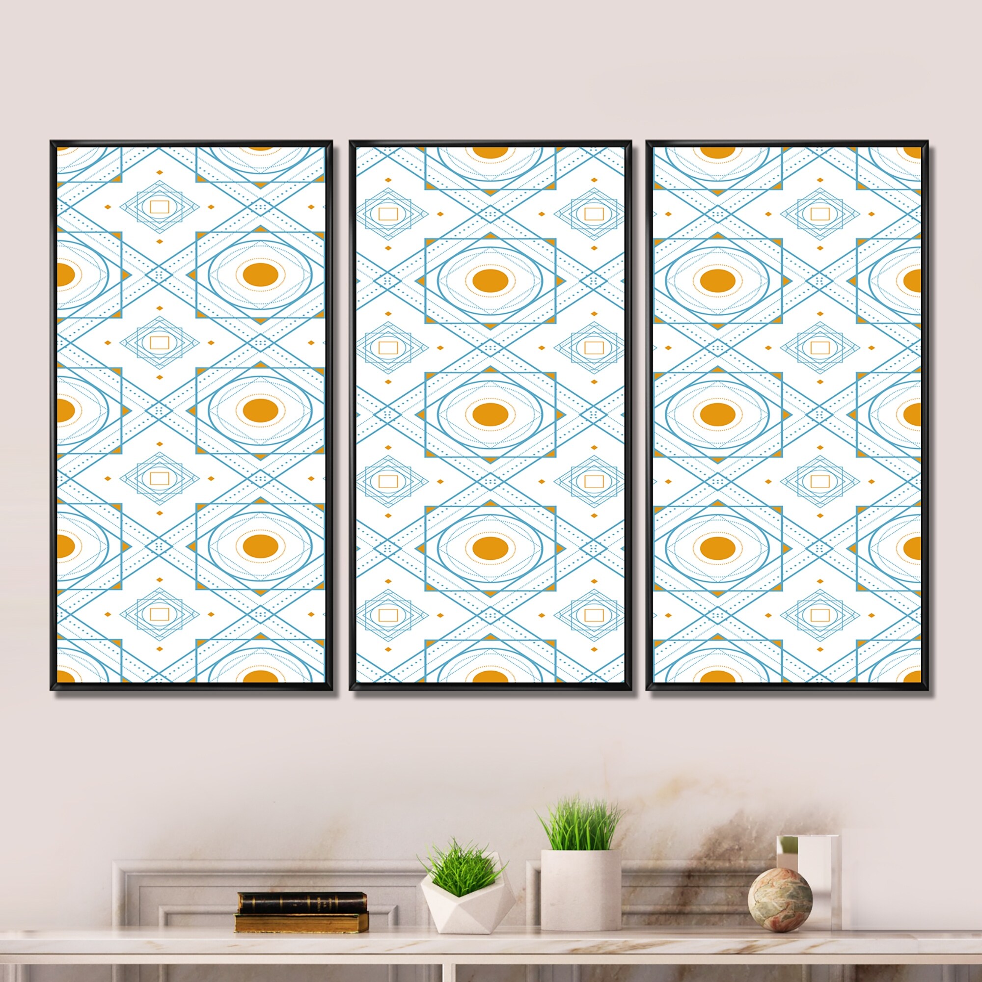 Designart "Retro Minimal Patttern in Orange and Bluye" Mid-Century Modern Framed Wall Decor Set of 3 - 4 Colors of Frames