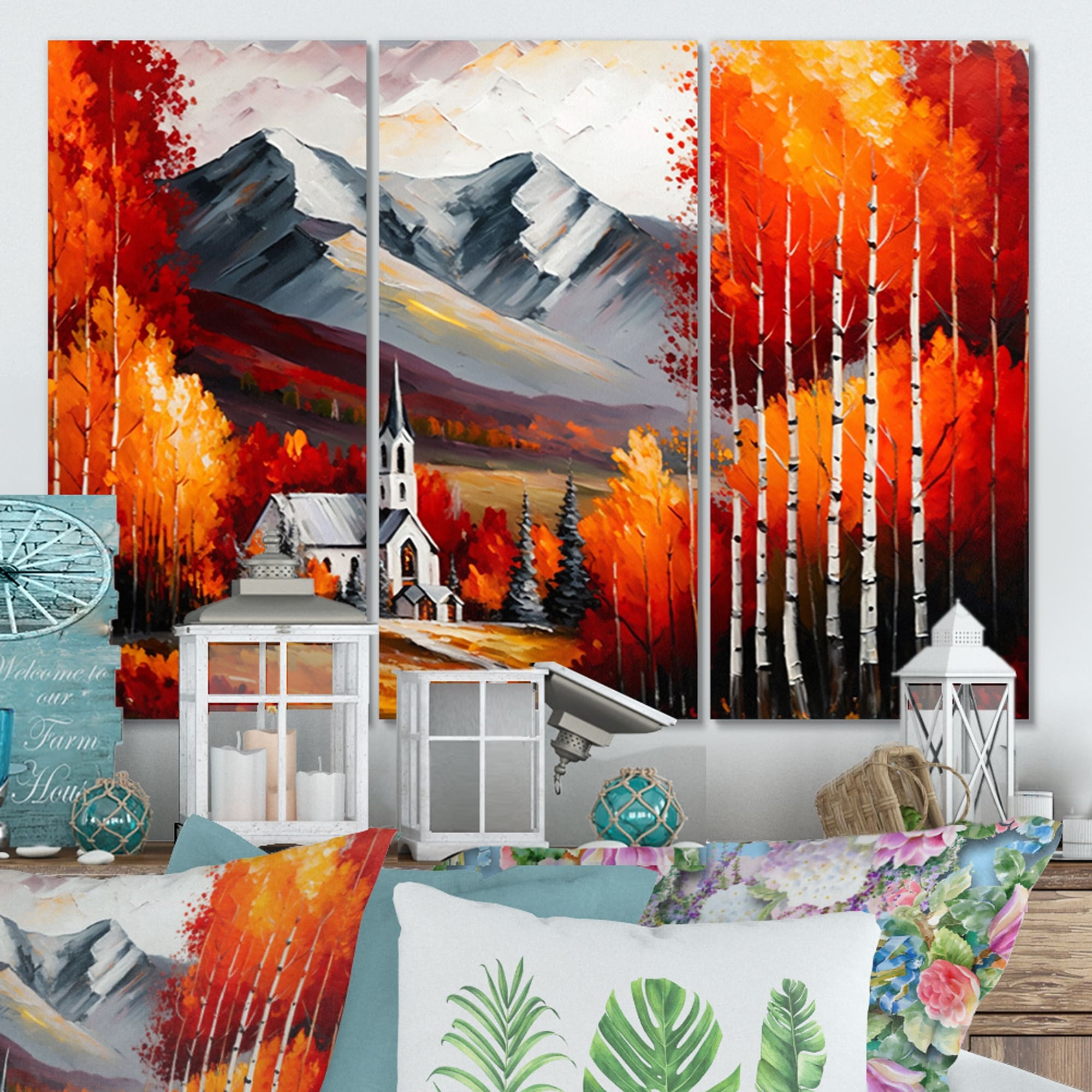 Designart "Monochrome Orange Cottage in Winter VI" Landscape Church Canvas Art Print - 3 Panels