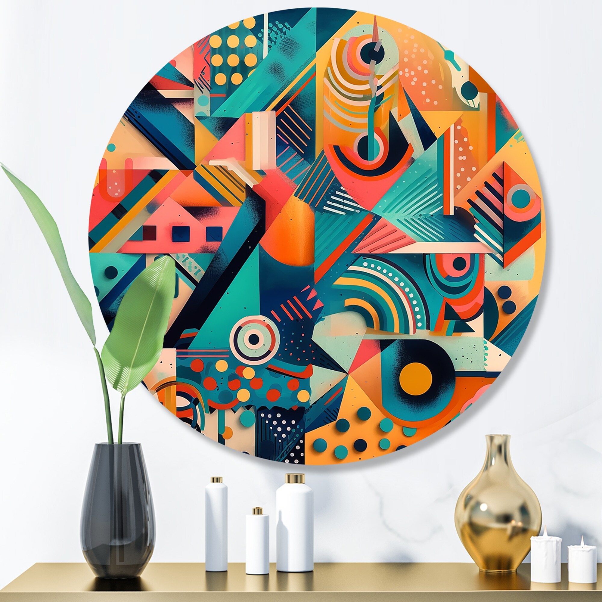 Designart "Orange And Blue Geometric Compositions" Modern Geometric Metal Round Wall Art
