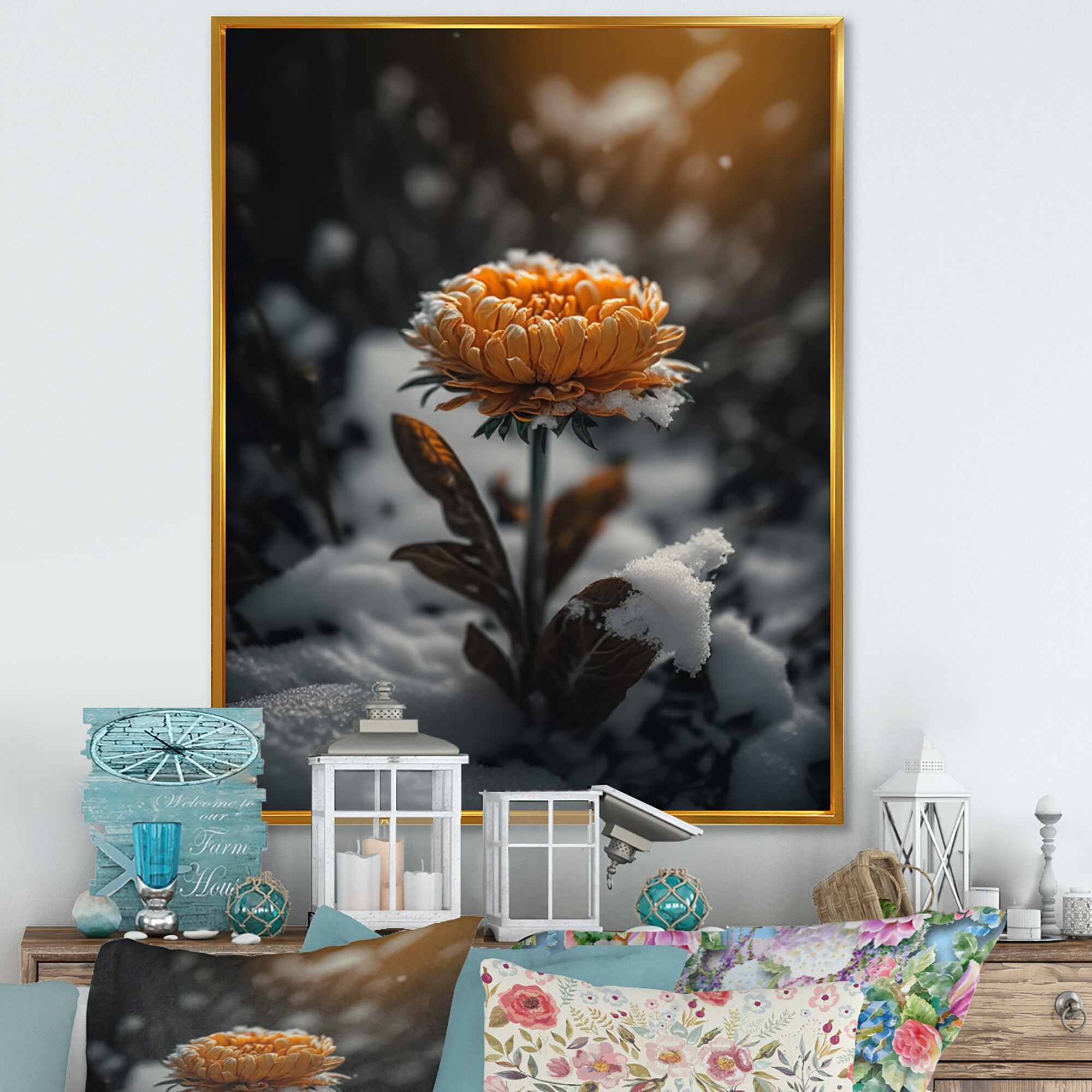 Designart "A Blooming Orange Marigold Flower in Winter III" Floral & Botanical Framed Canvas Art Print