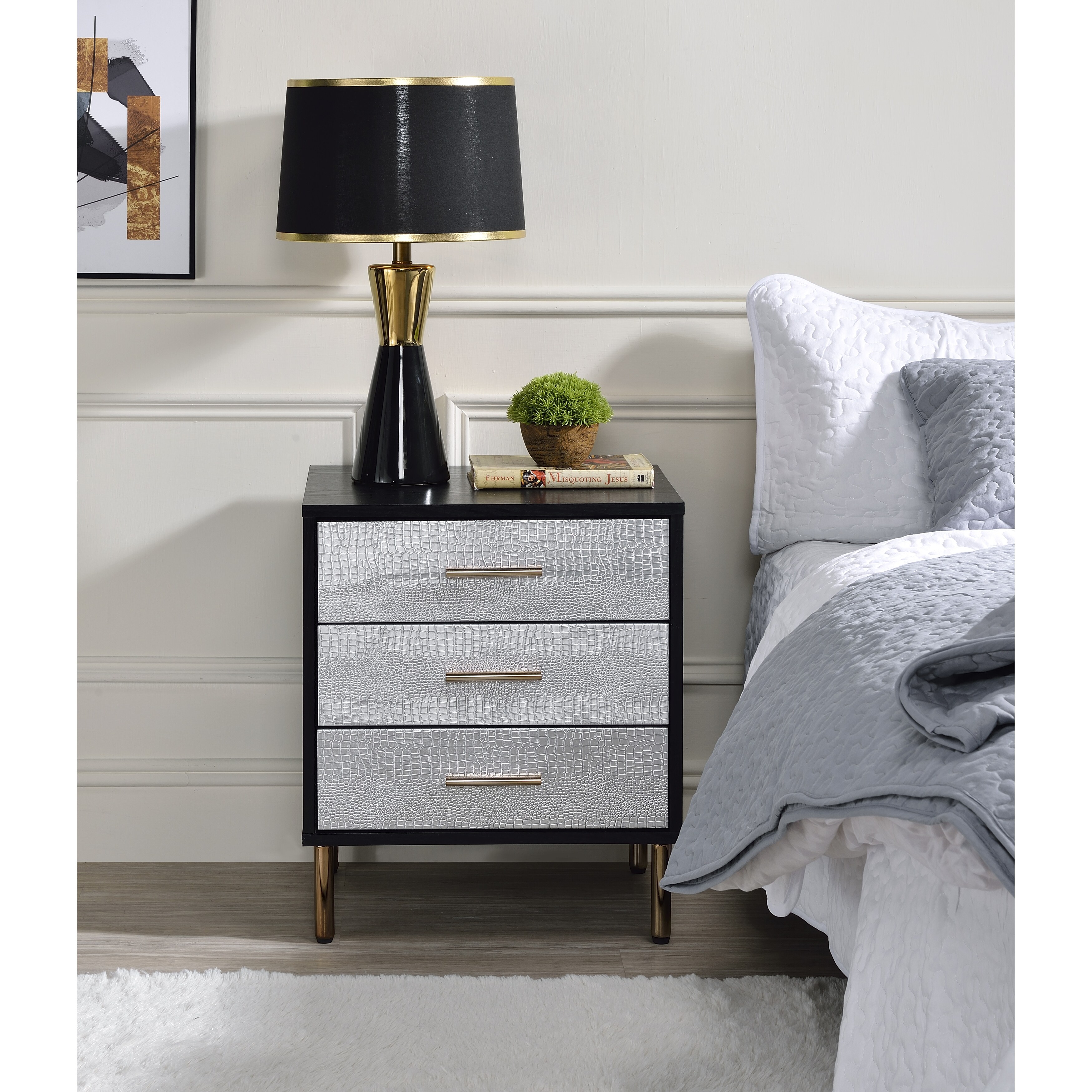 Contemporary Nightstand with Metal Legs, Pattern Drawer Front, and 3 Storage Drawers