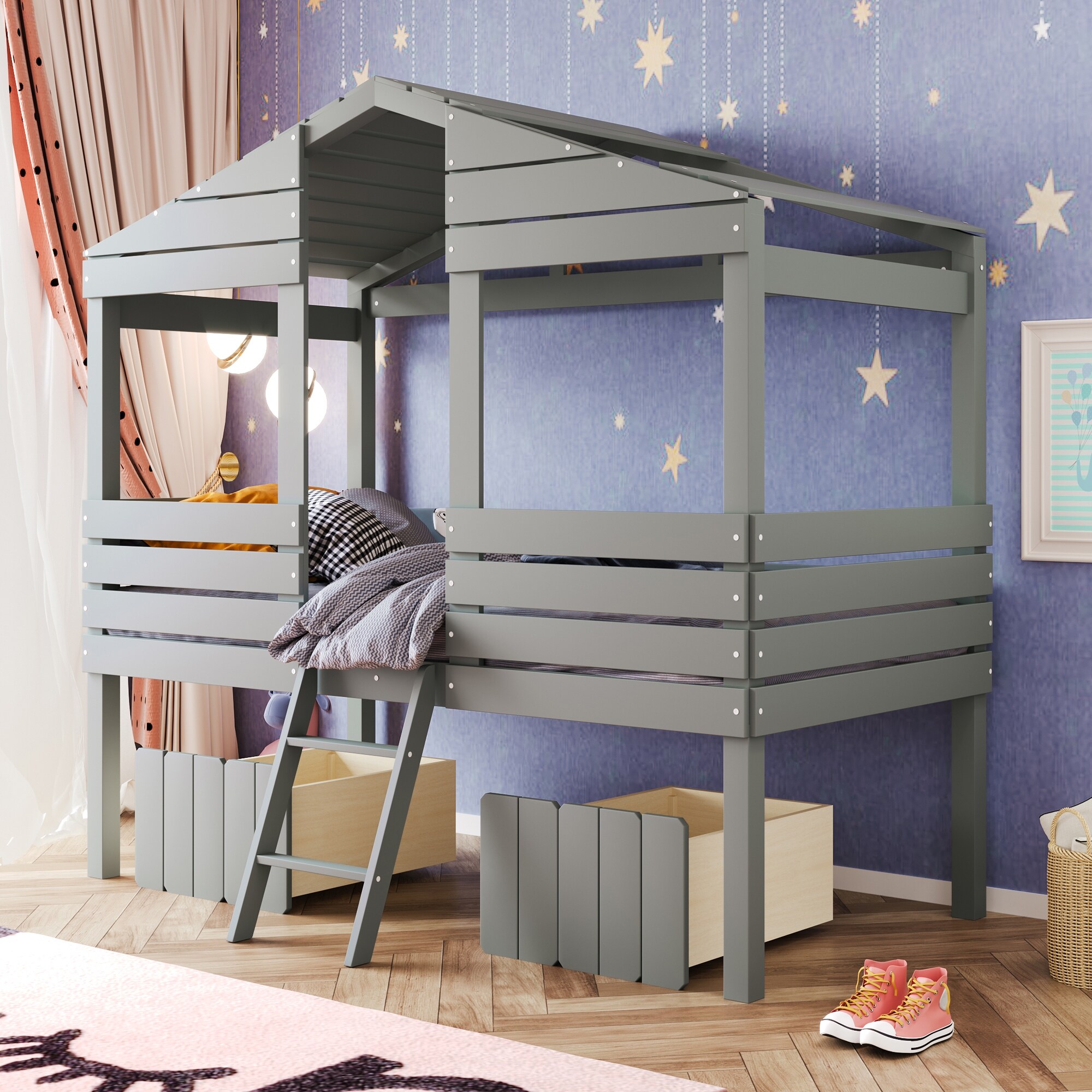Twin Size Loft Bed w/2 Front Windows, House-Shaped Roof, Grey