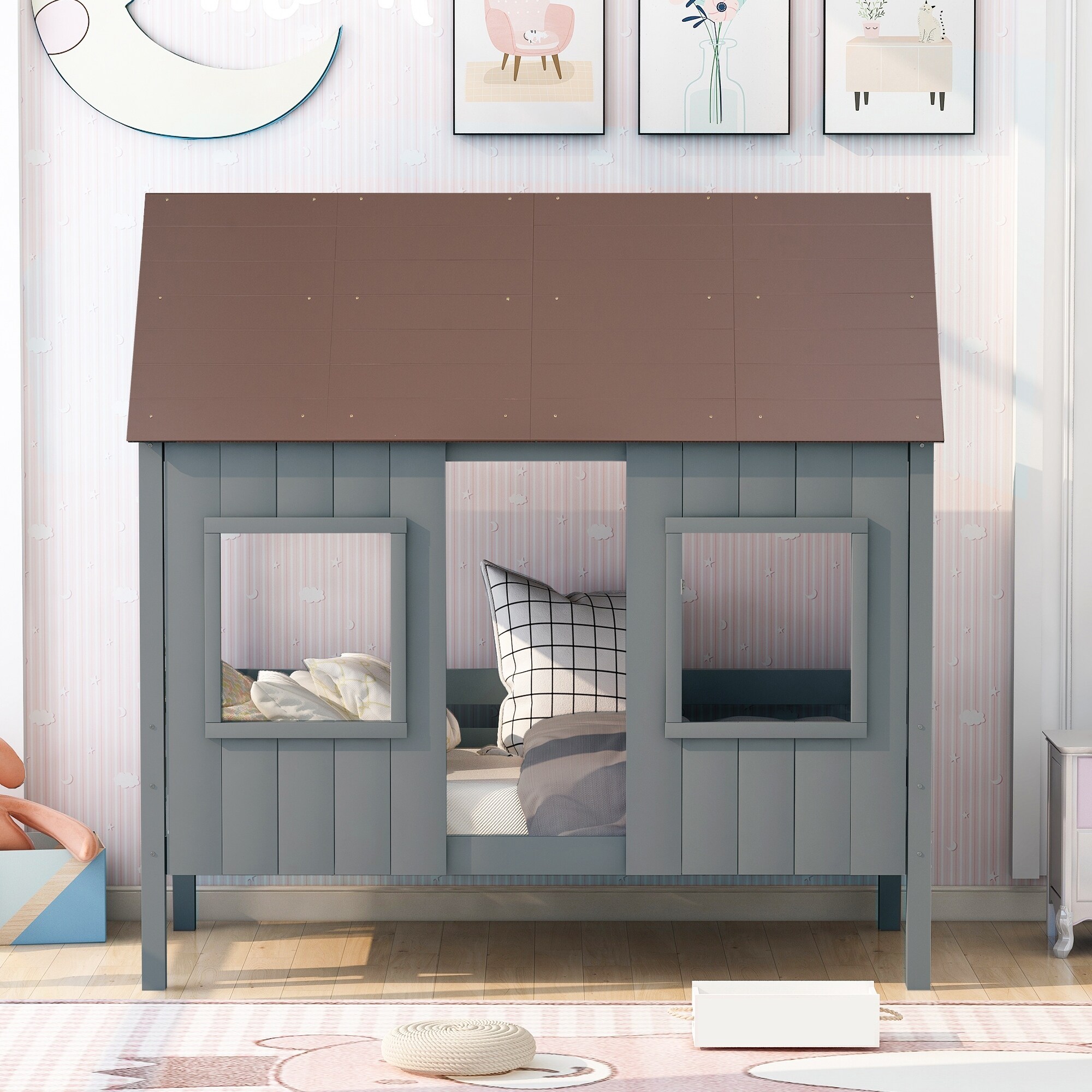 Twin Size Low Loft Wood House Bed with Two Front Windows, Grey