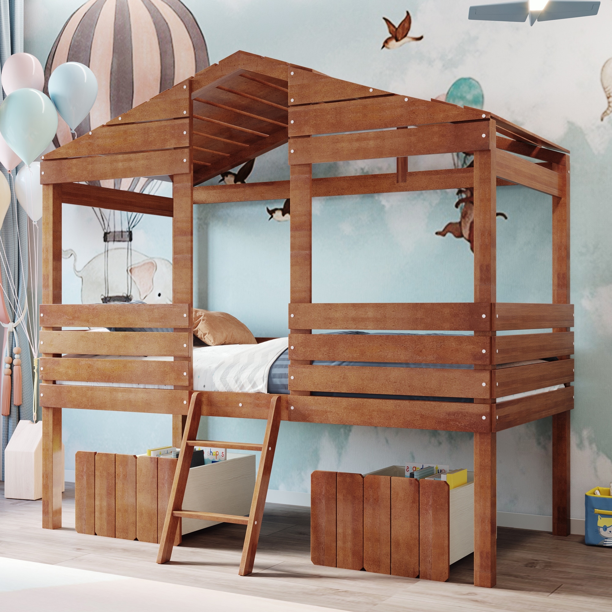 Twin Size Low Loft Wood House Bed with Two Front Windows, Pinewood Frame Playhouse Bed with Roof