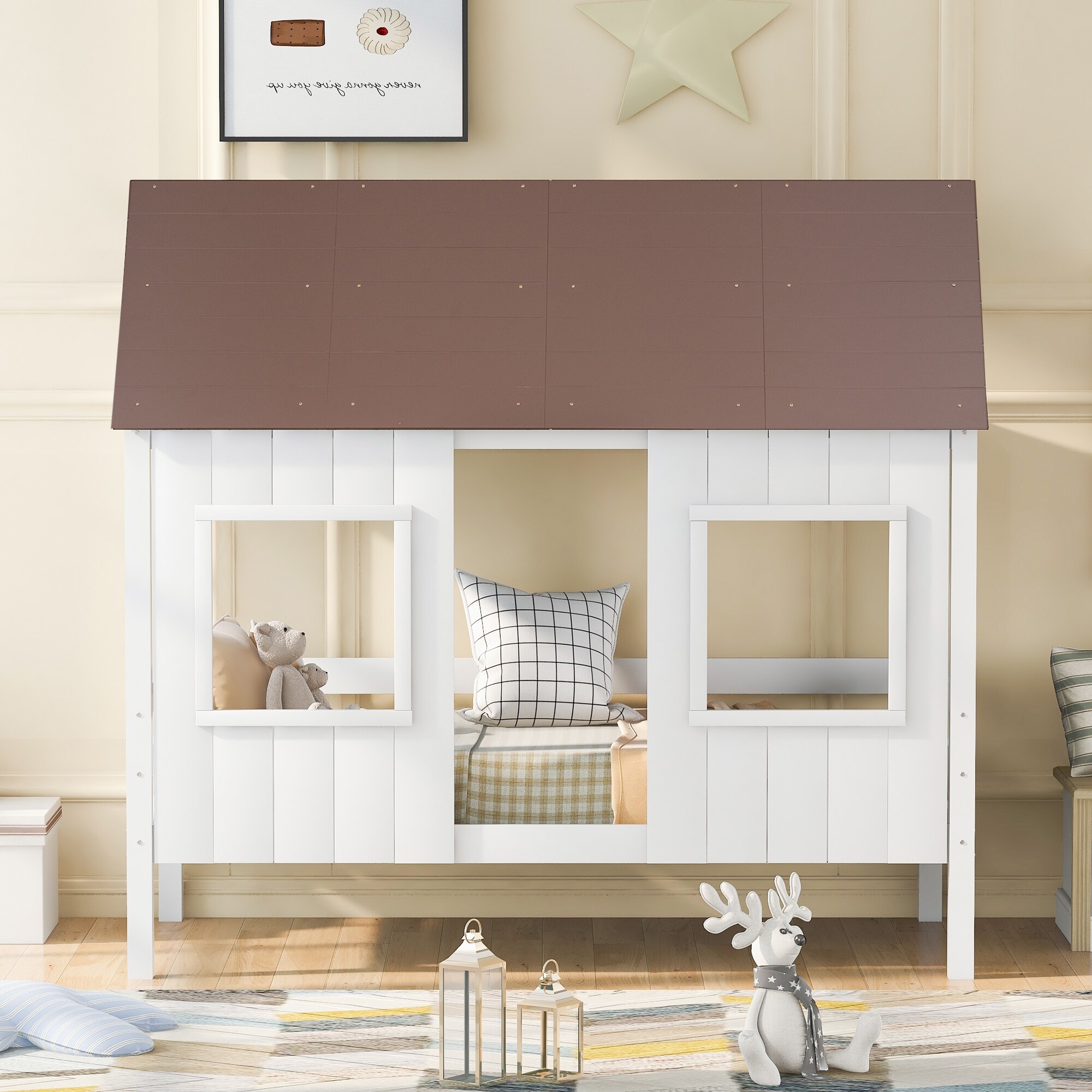 Twin Size Wooden Low Loft Wood House Bed with Two Front Windows and Roof