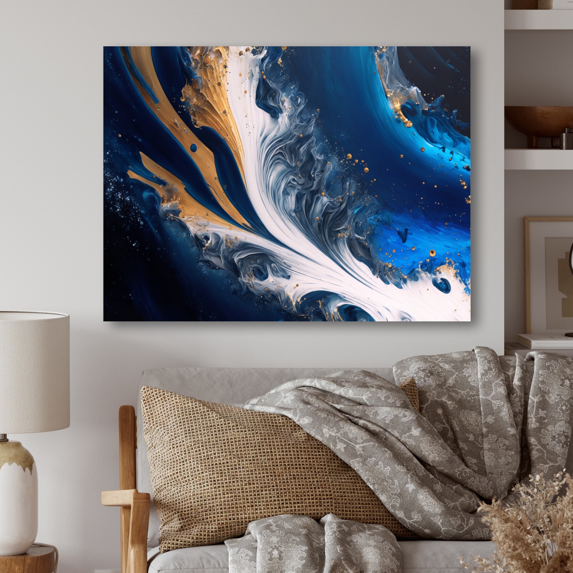 Designart "Golden Wave Reflections II" Abstract Painting Framed Wall Art Living Room