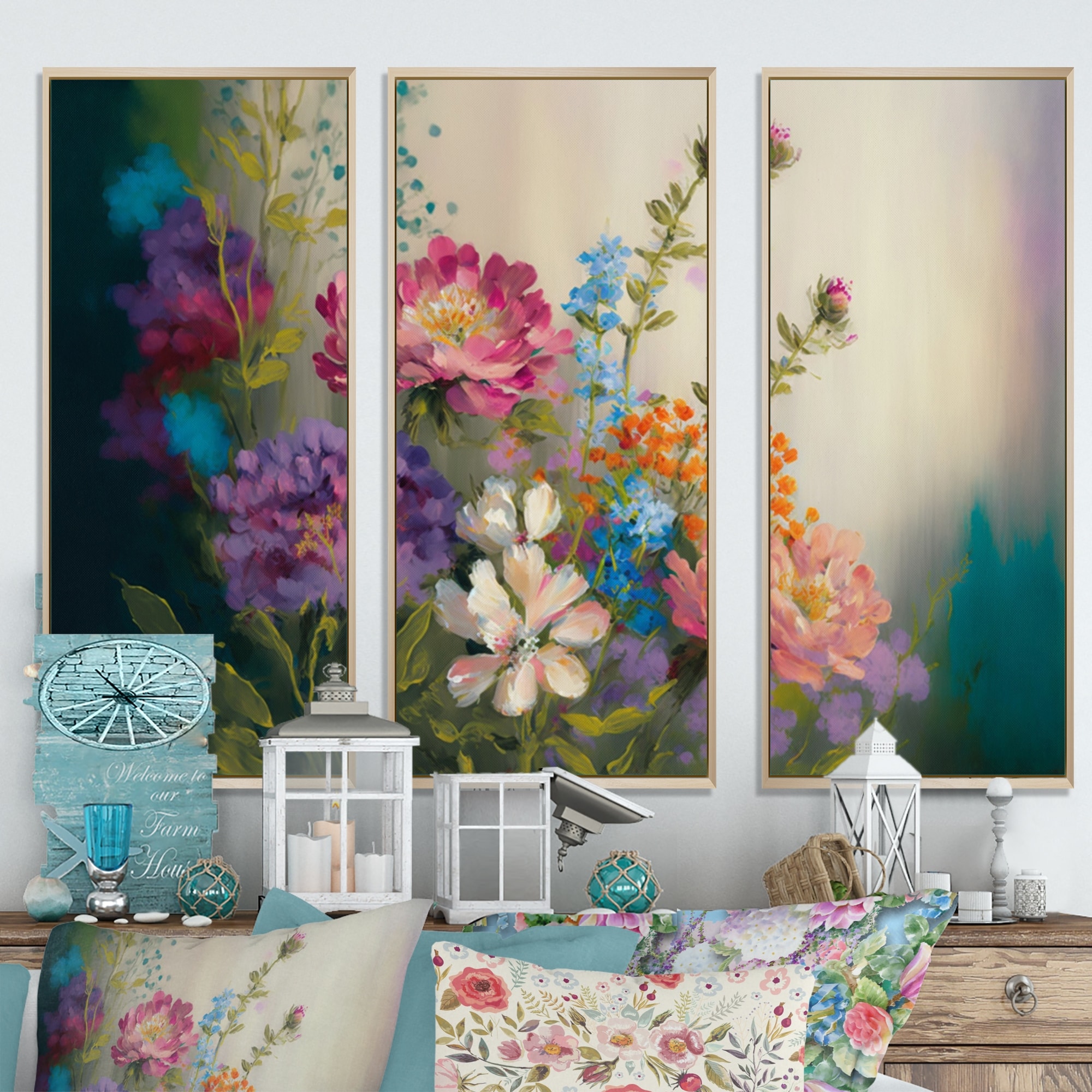 Designart "Painted Blossoming Wildflowers III" Floral Bouquet Framed Canvas Wall Art Print - 3 Panels