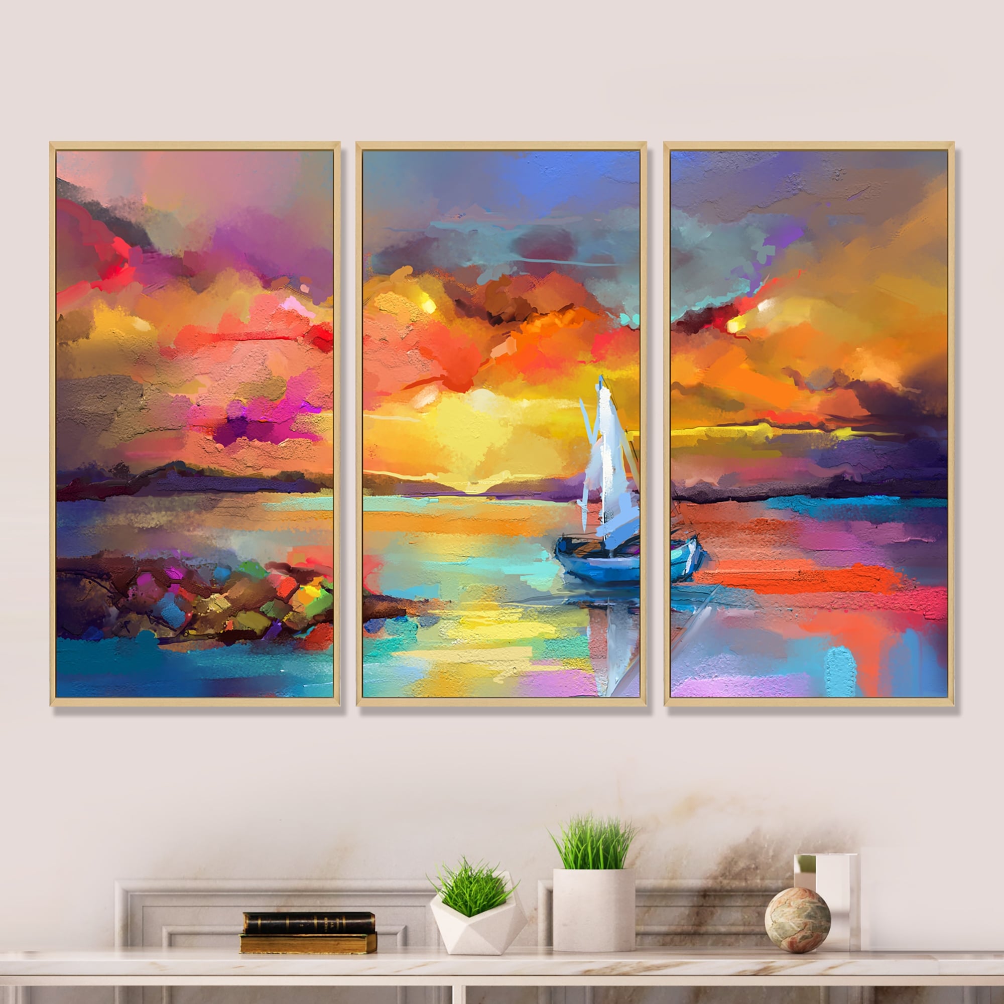 Designart "Sunset Painting With Colorful Reflections II" Modern & Contemporary Framed Art Prints Set of 3 - 4 Colors of Frames