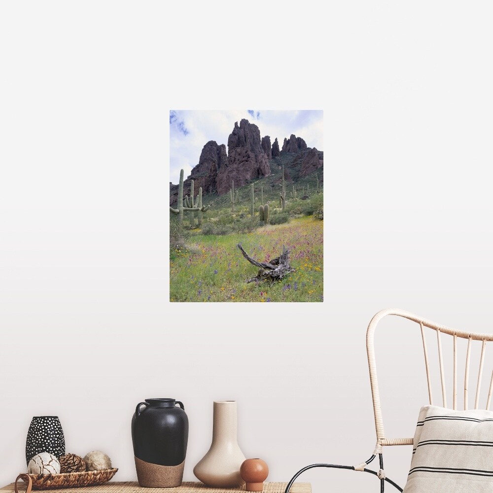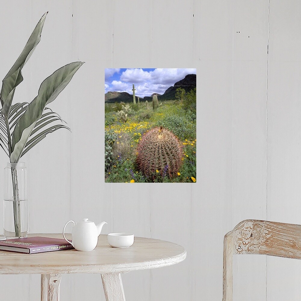 "Arizona, Organ Pipe Cactus National Monument, Cactus and wildflowers in a landscape" Poster Print