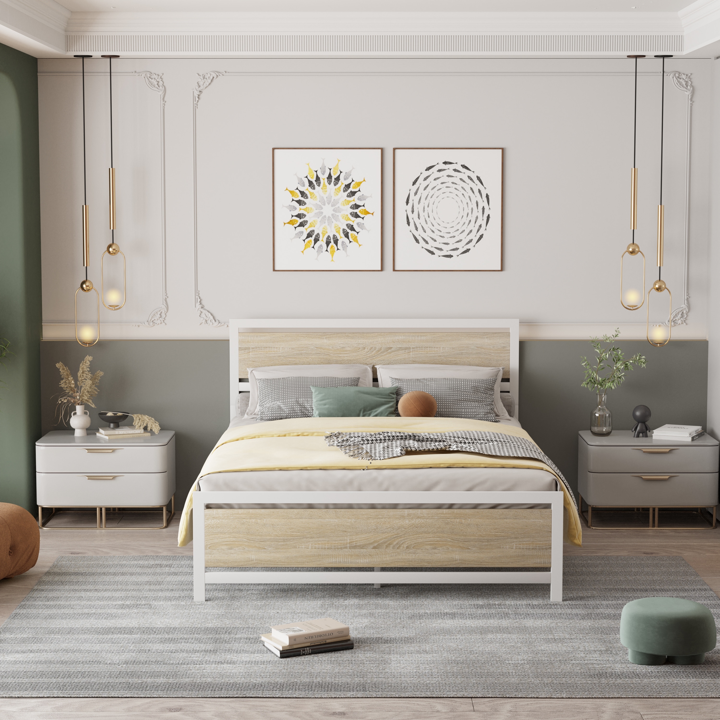 Metal Bed Frame with Wood Headboard and Footboard, Queen Size