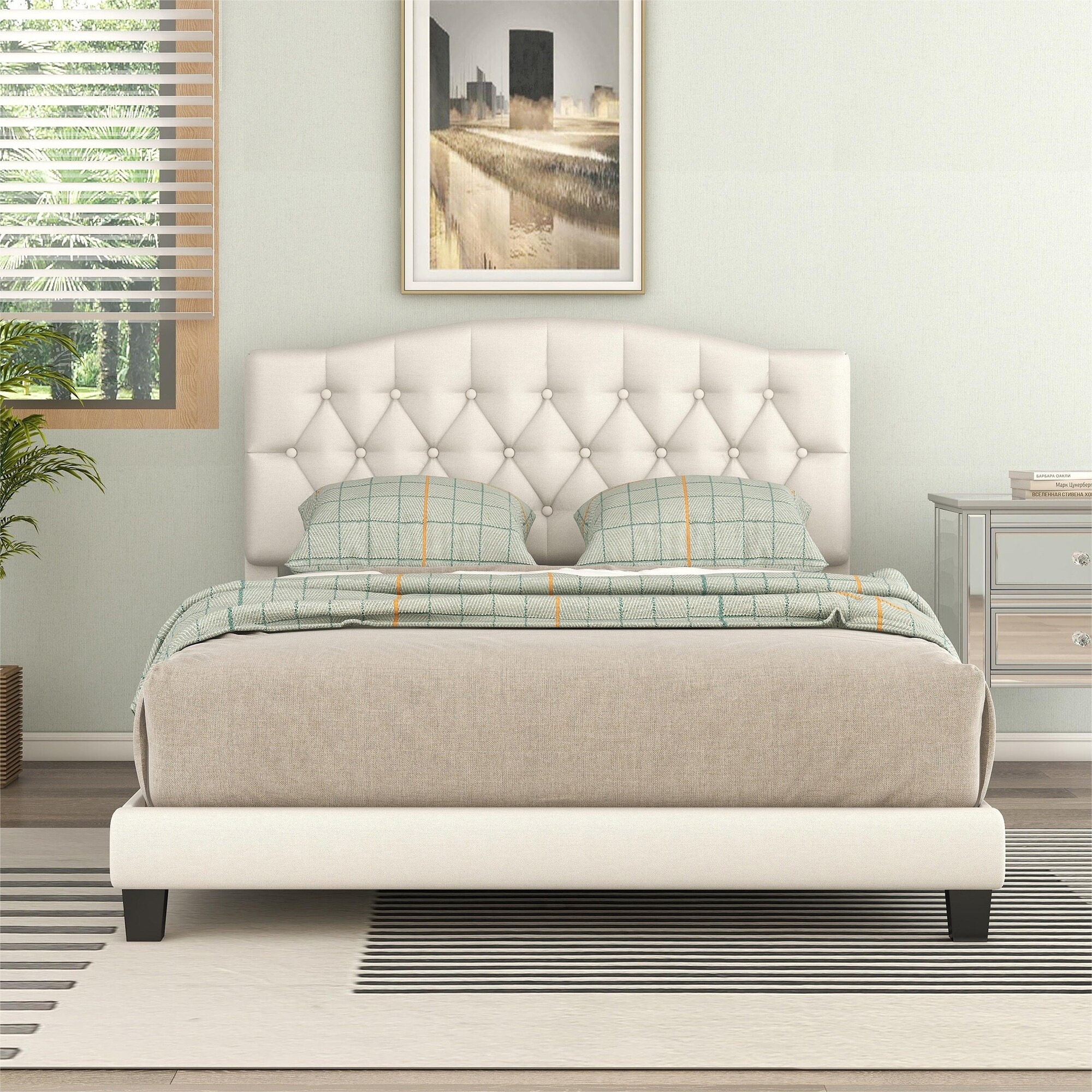 Queen Platform Bed Frame Soft Tufted Headboard Rubber Wood Leg Beige