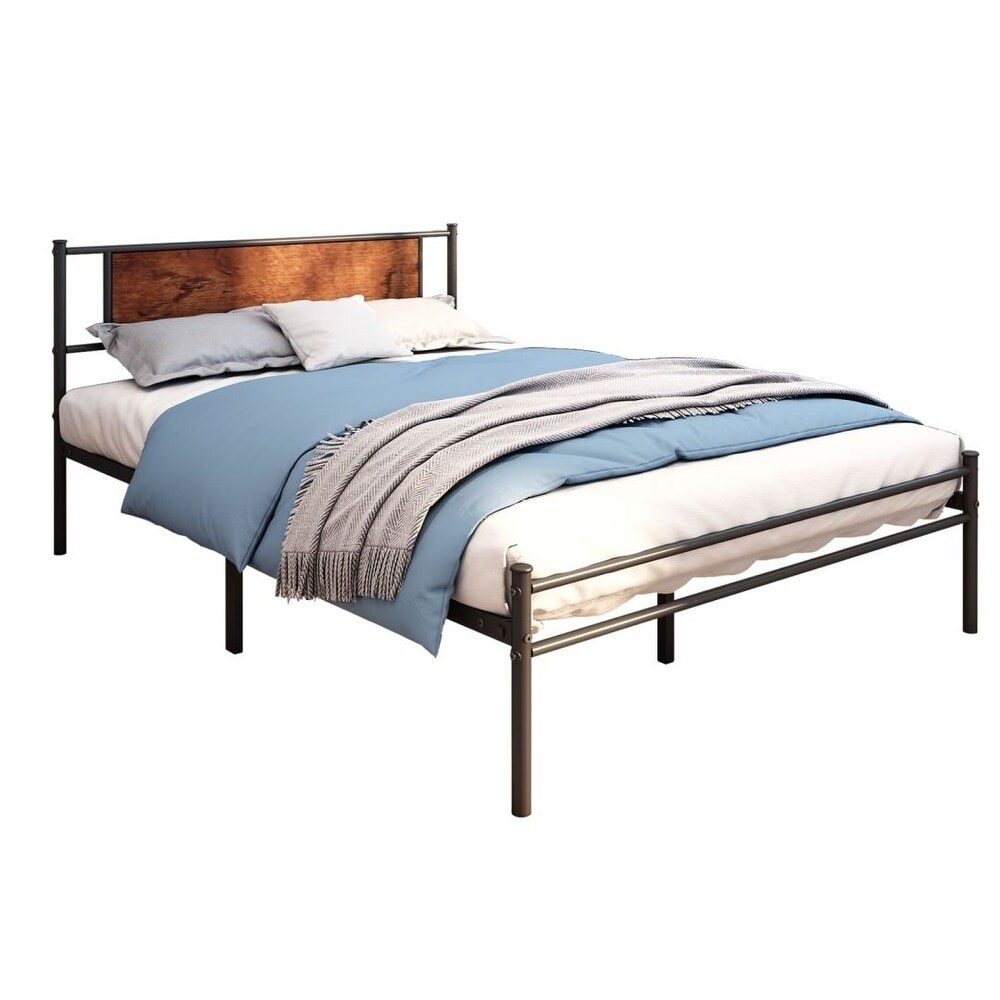 Queen Size Metal Bed Frame with Wood Headboard