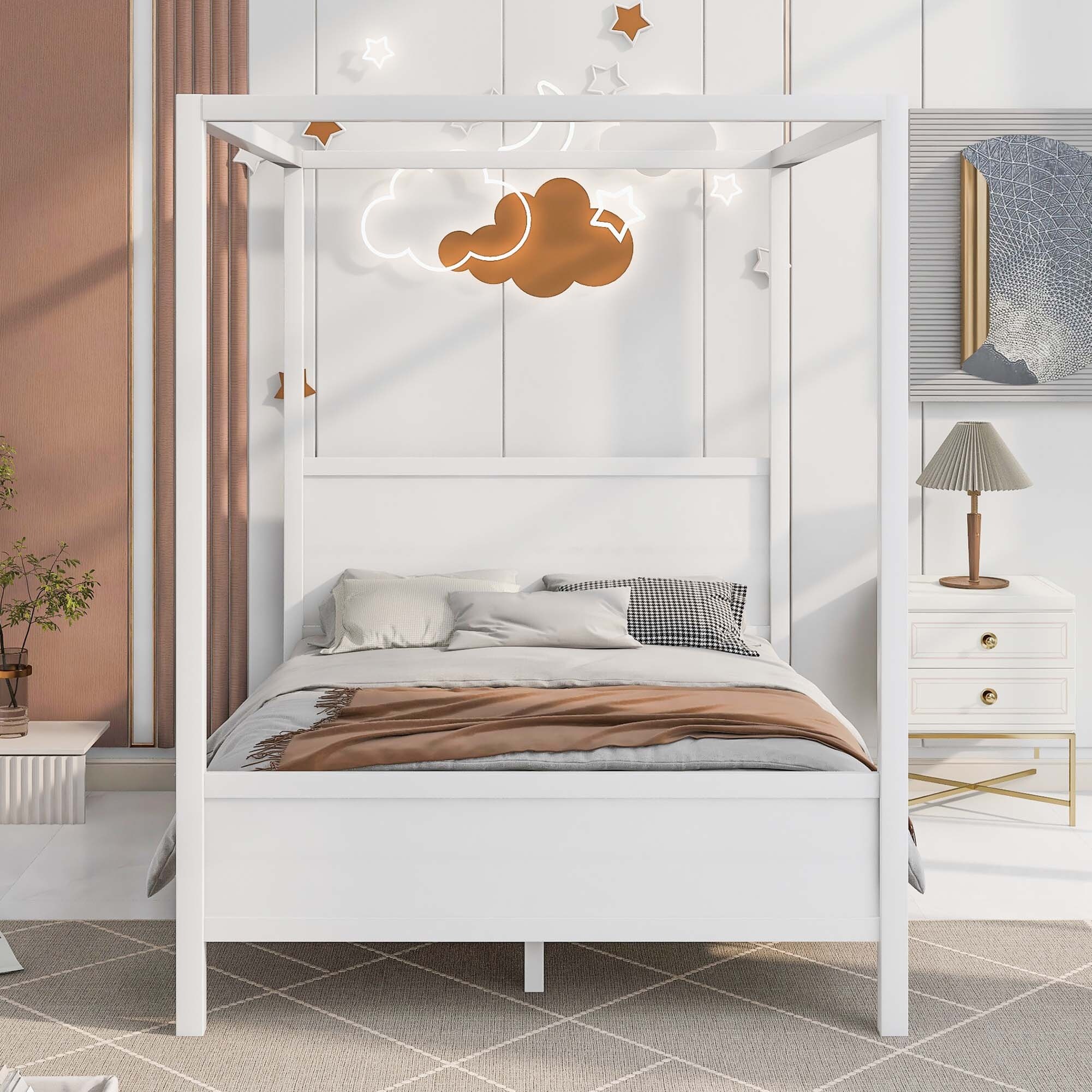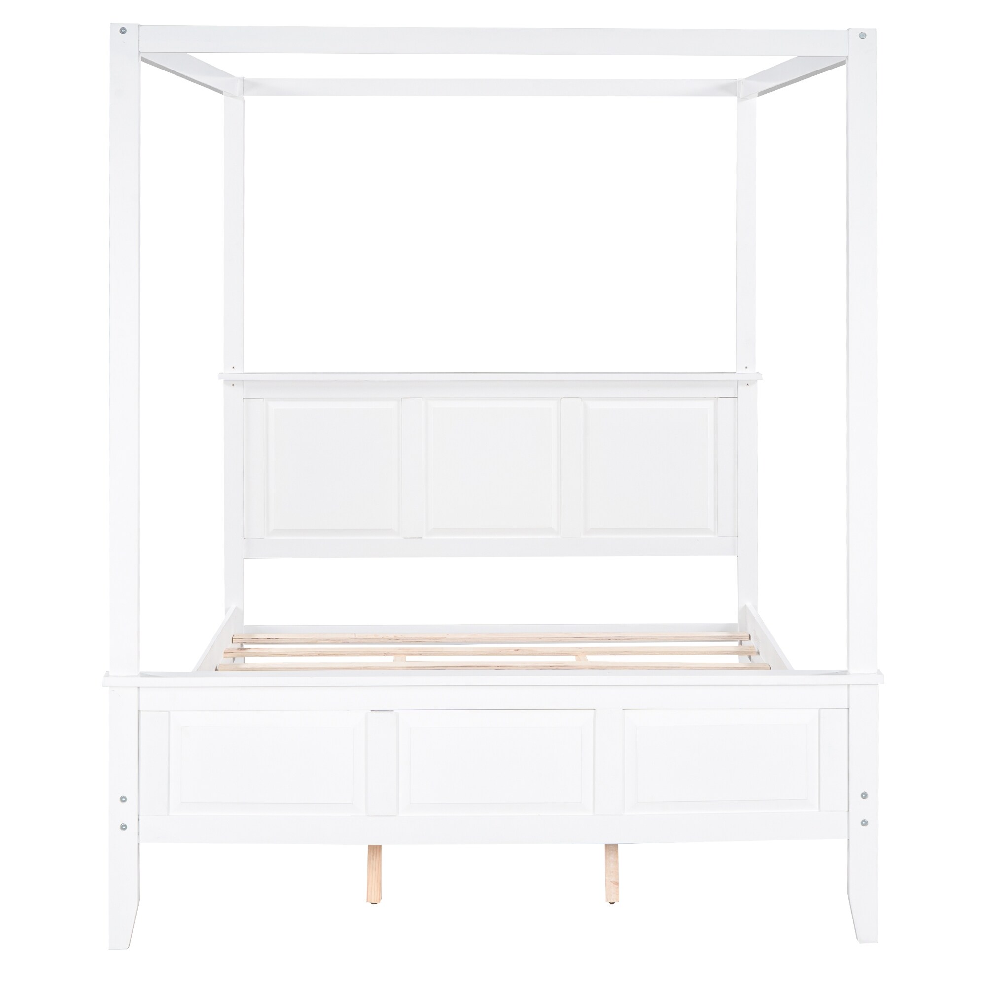 Queen Canopy Platform Bed for Kids Bedroom, Wooden Bedframe w/ Headboard & Footboard & Slat Support Leg for Small Space, White
