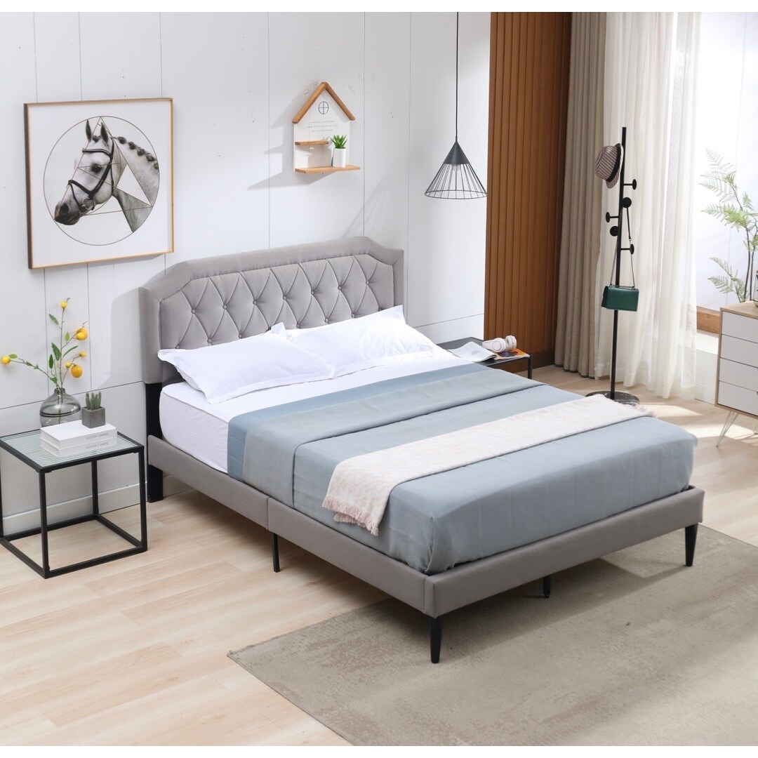 Linen Upholstered Platform Bed with Tufted Headboard, Queen Size