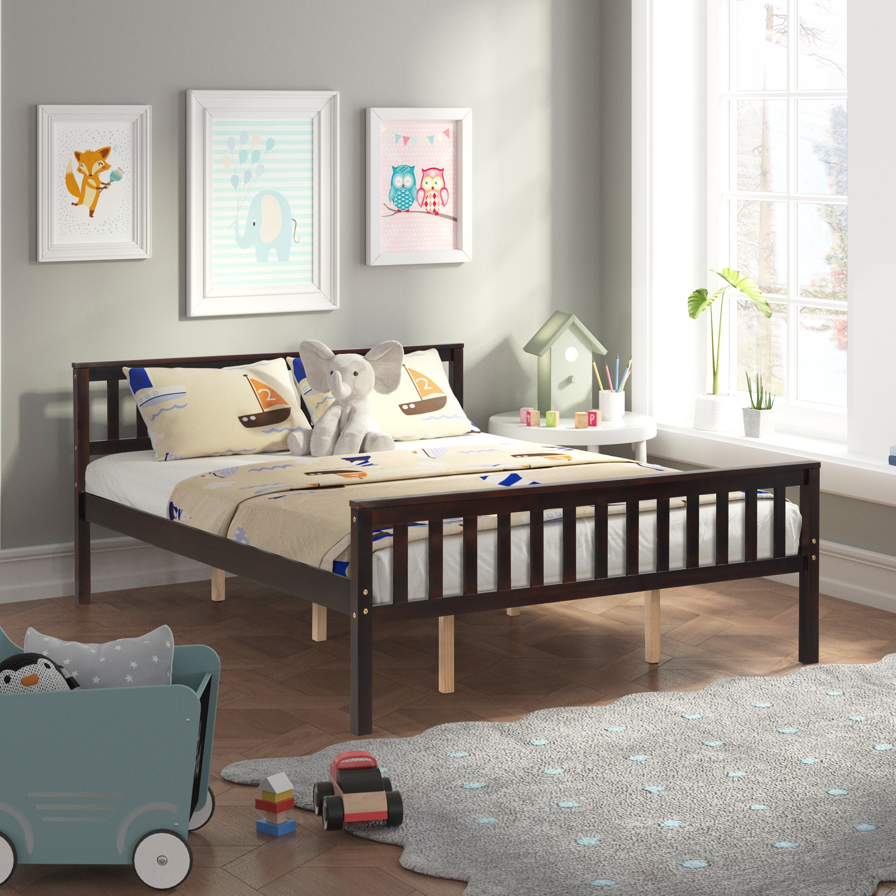 Queen Size Wood Platform Sleigh Bed with Slats Style Headboard Footboard, Espresso