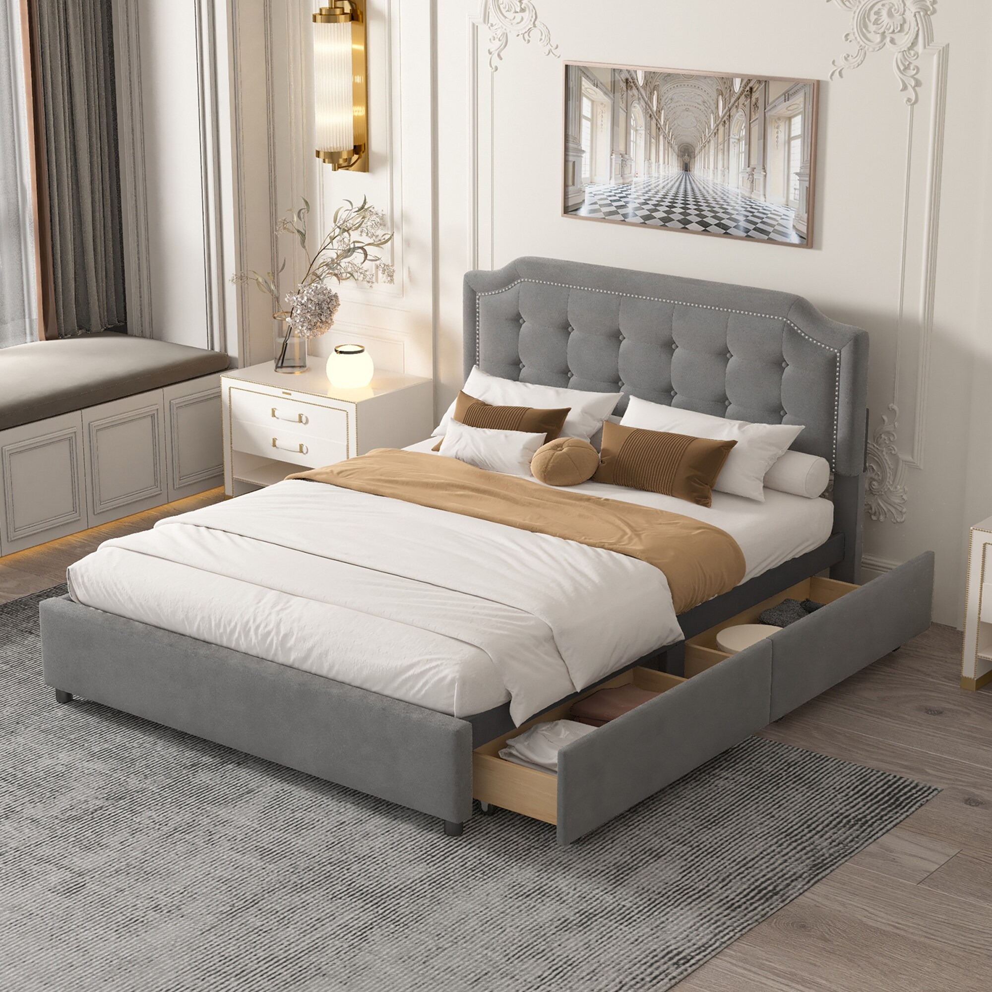 Queen Size Upholstery Platform Bed with Two Drawers