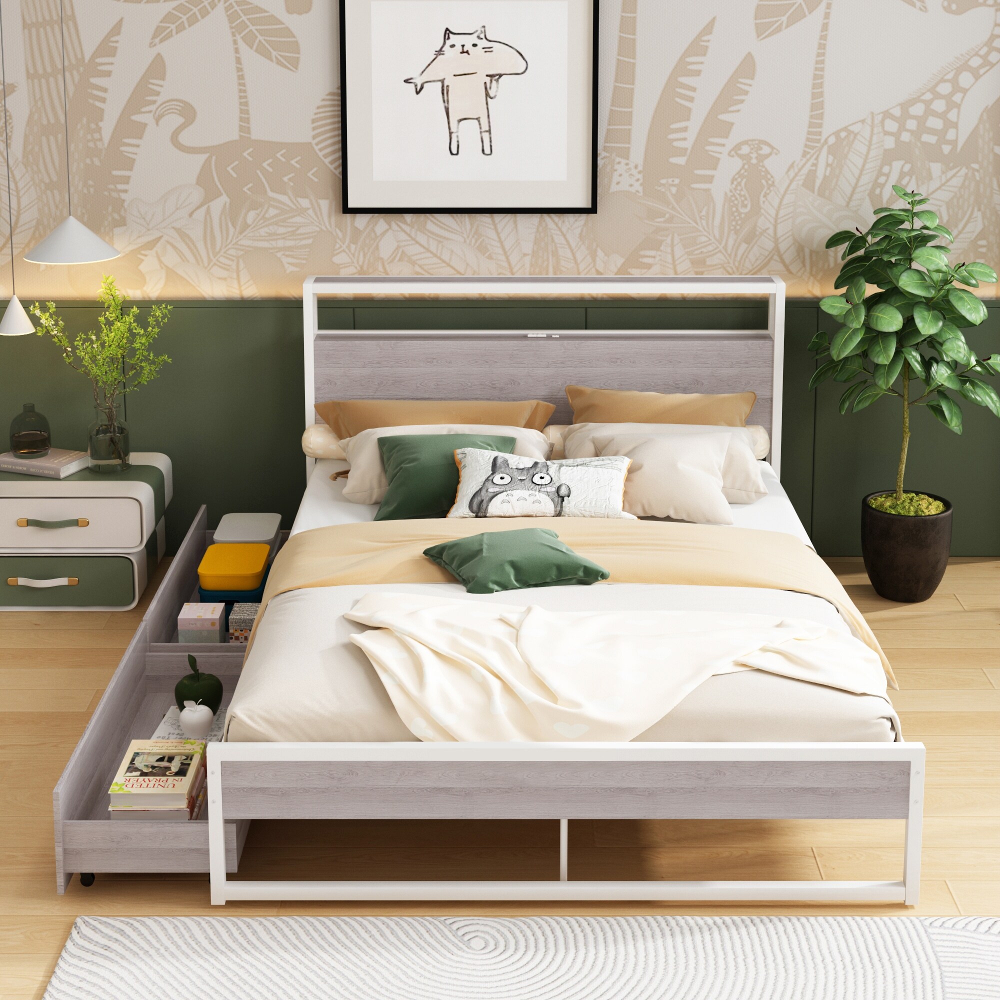 Queen Size Platform Bed Metal Bed Frame with Two Drawers & USB Ports