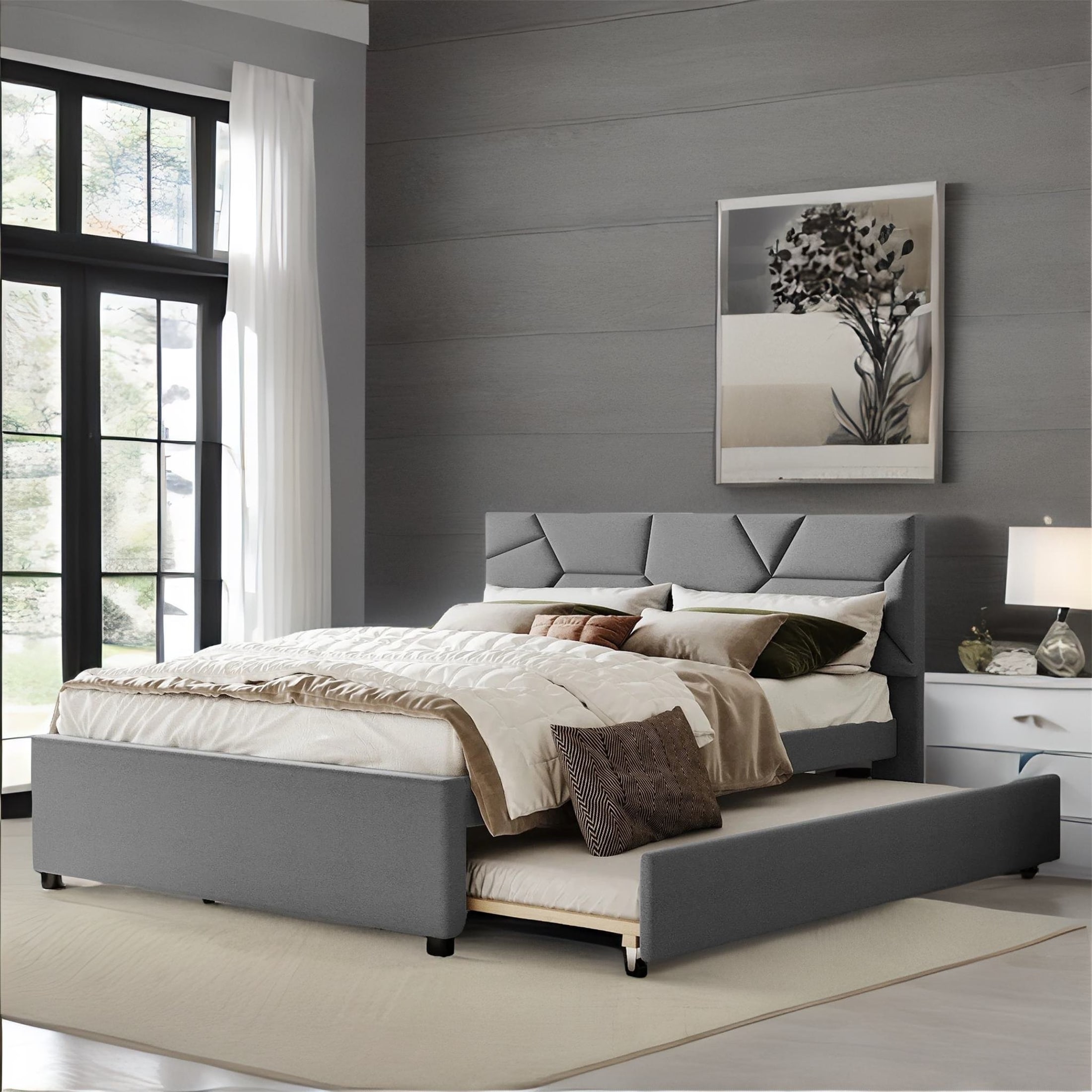 Queen Size Upholstered Linen Platform Bed with Twin XL Trundle