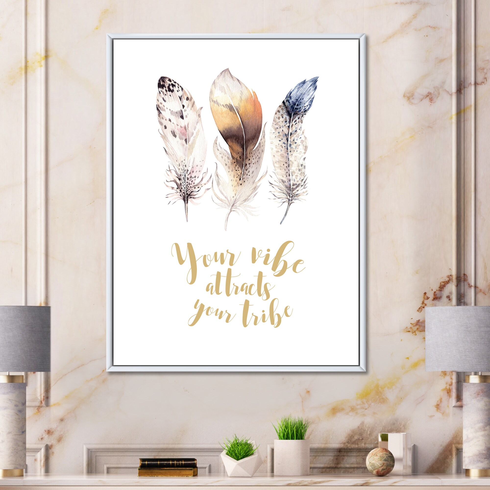 Designart "Multicolored Ethnic Feathers With Inspiring Quote" Bohemian & Eclectic Framed Canvas Wall Art Print