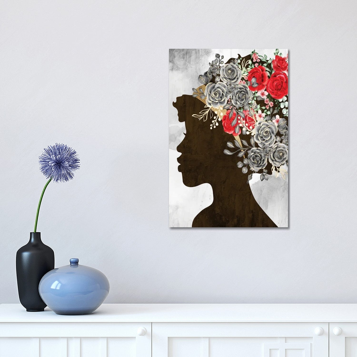 Designart "Woman Silhouette With Red And Purple Flowers XI" Glam Framed Canvas Wall Art Print