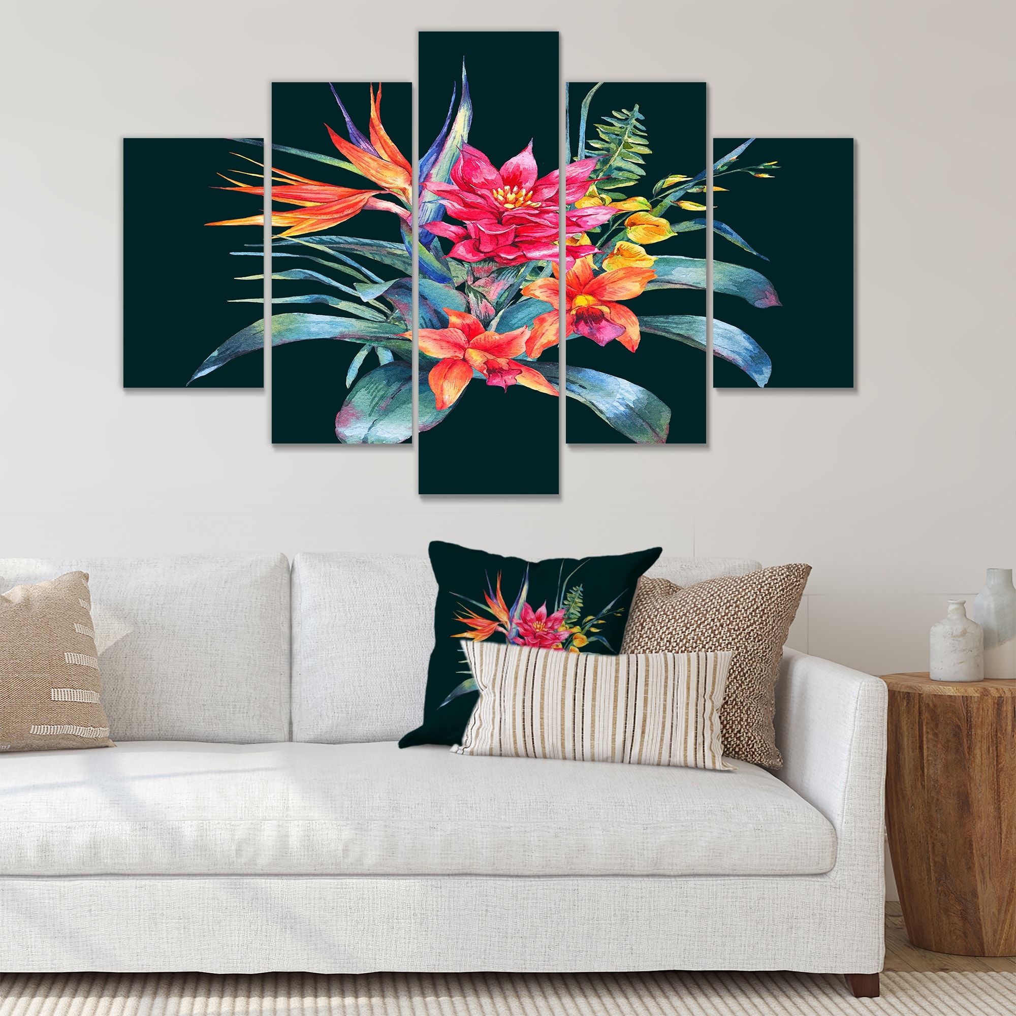 Designart "Red And Orange Tropical Flower on Black I" Traditional Canvas Wall Art Print - 60x32 - 5 Panels