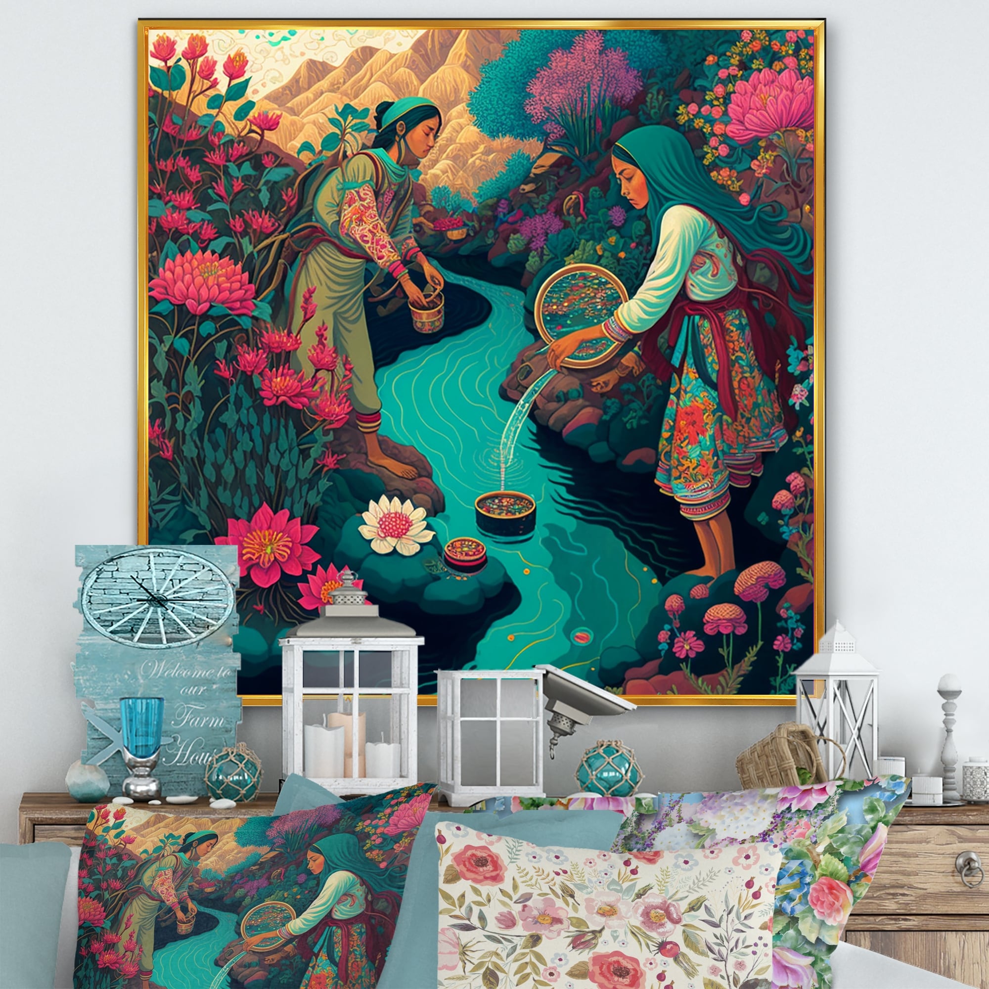 Designart "South American Villagers By the River" Landscape Cottage Framed Canvas Wall Art Print