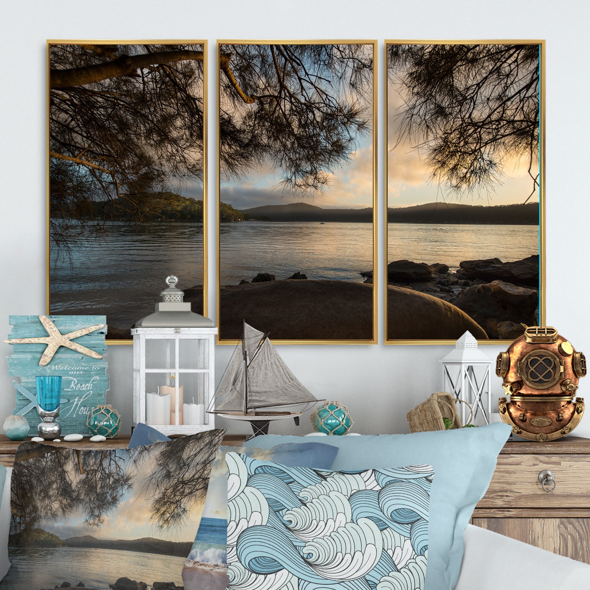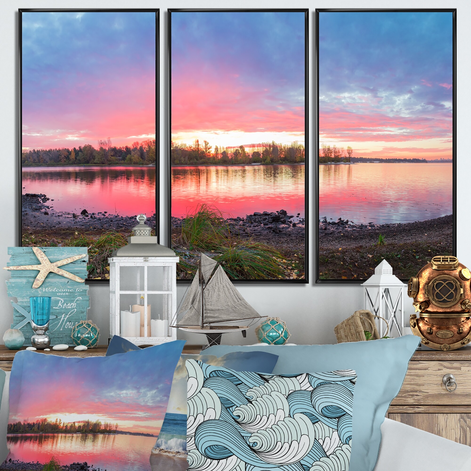 Designart "Sunrise from Hawsbury River" Sea & Shore Framed Canvas Wall Art Set of 3 - 4 Colors of Frames