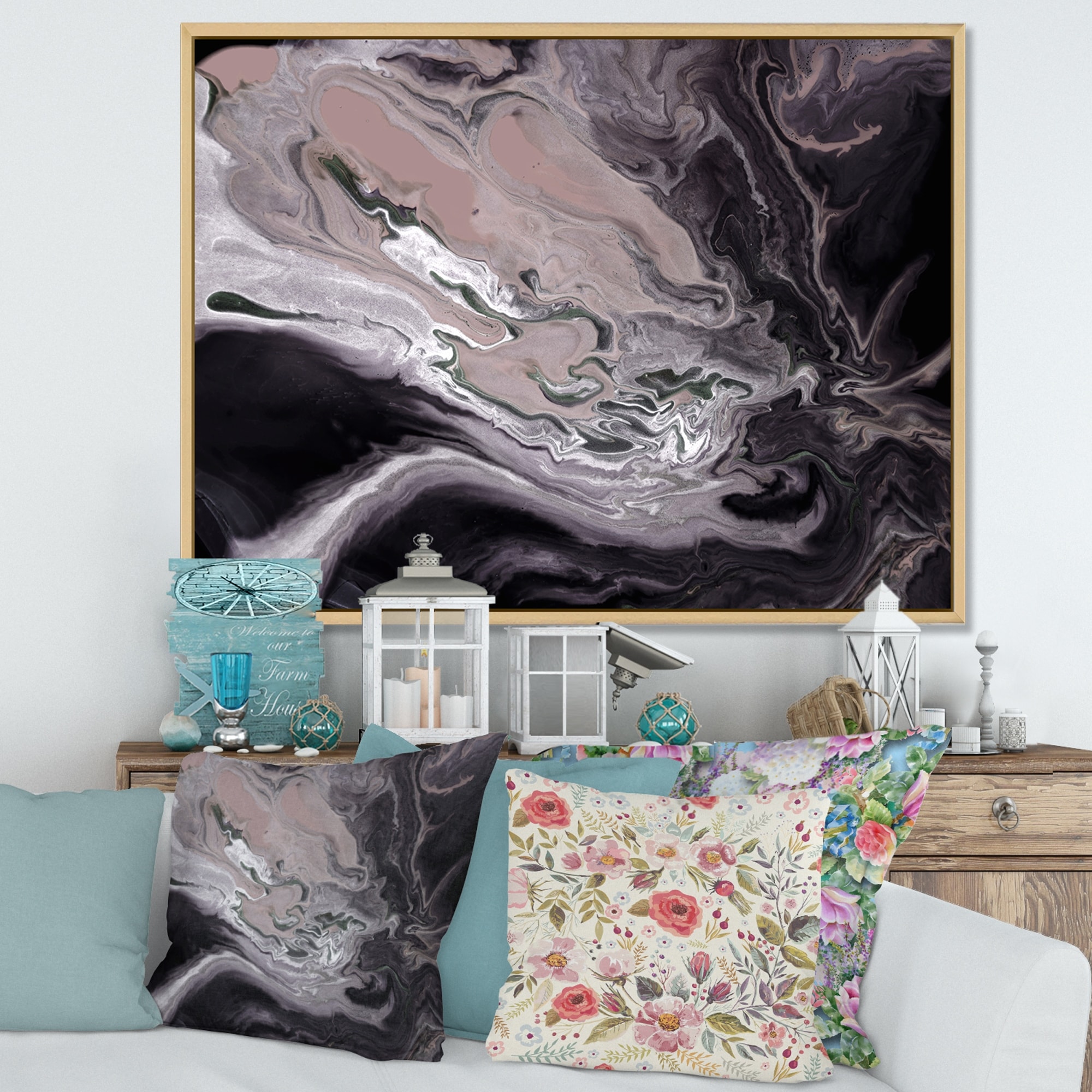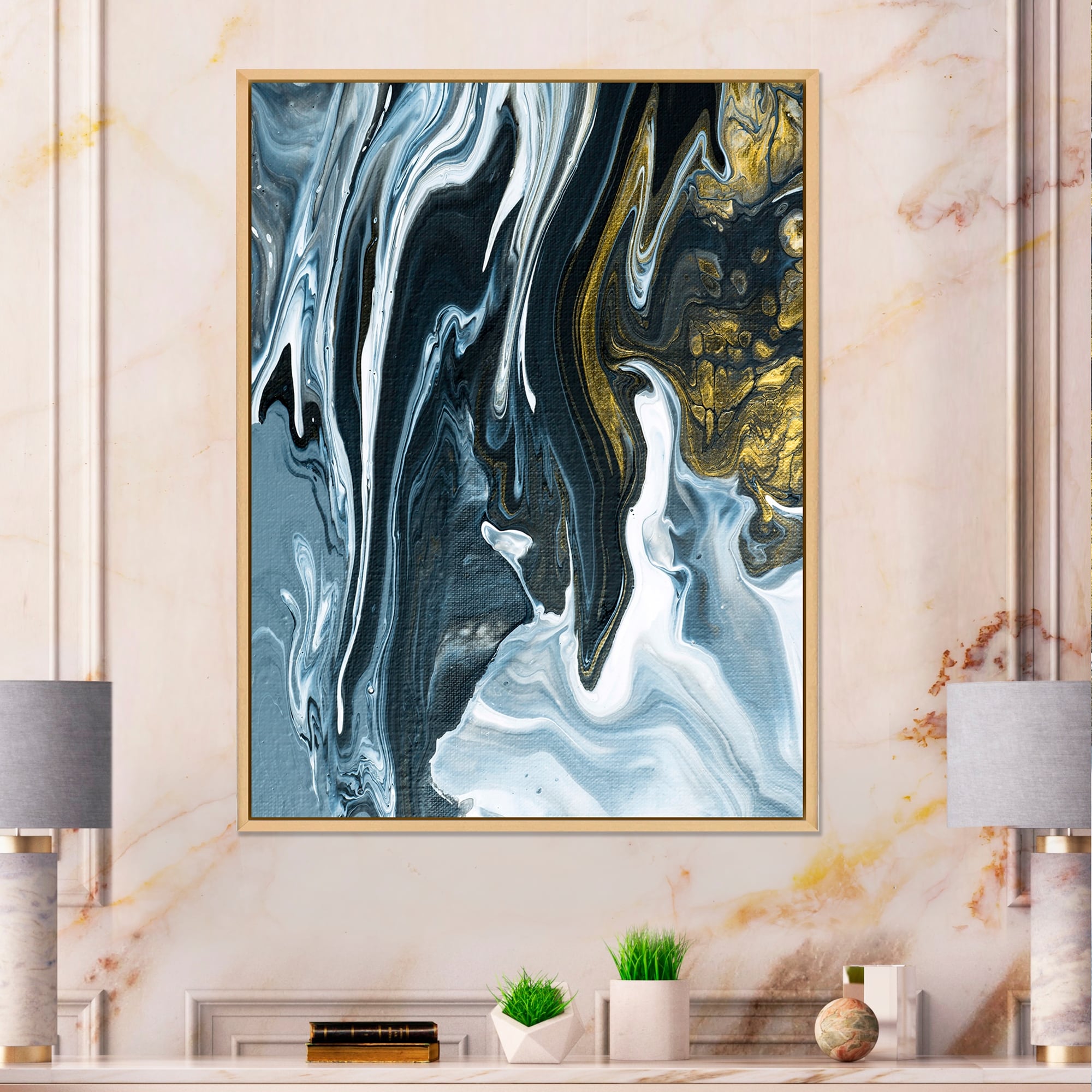 Designart "Dark Marble Universe With Grey Meandering River" Modern Framed Canvas Wall Art Print