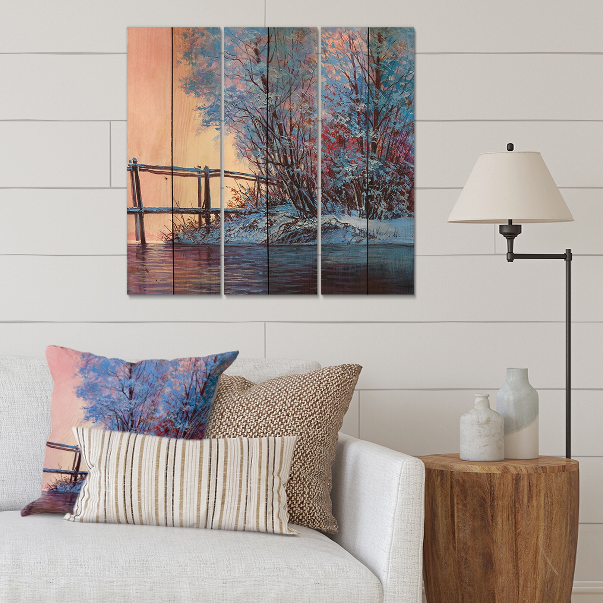 Designart 'Winter River Landscape' Traditional Wood Wall Art Panels - Natural Pine Wood