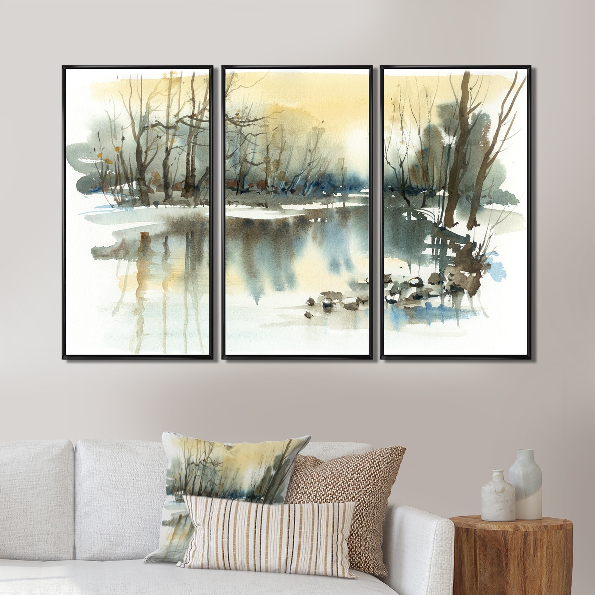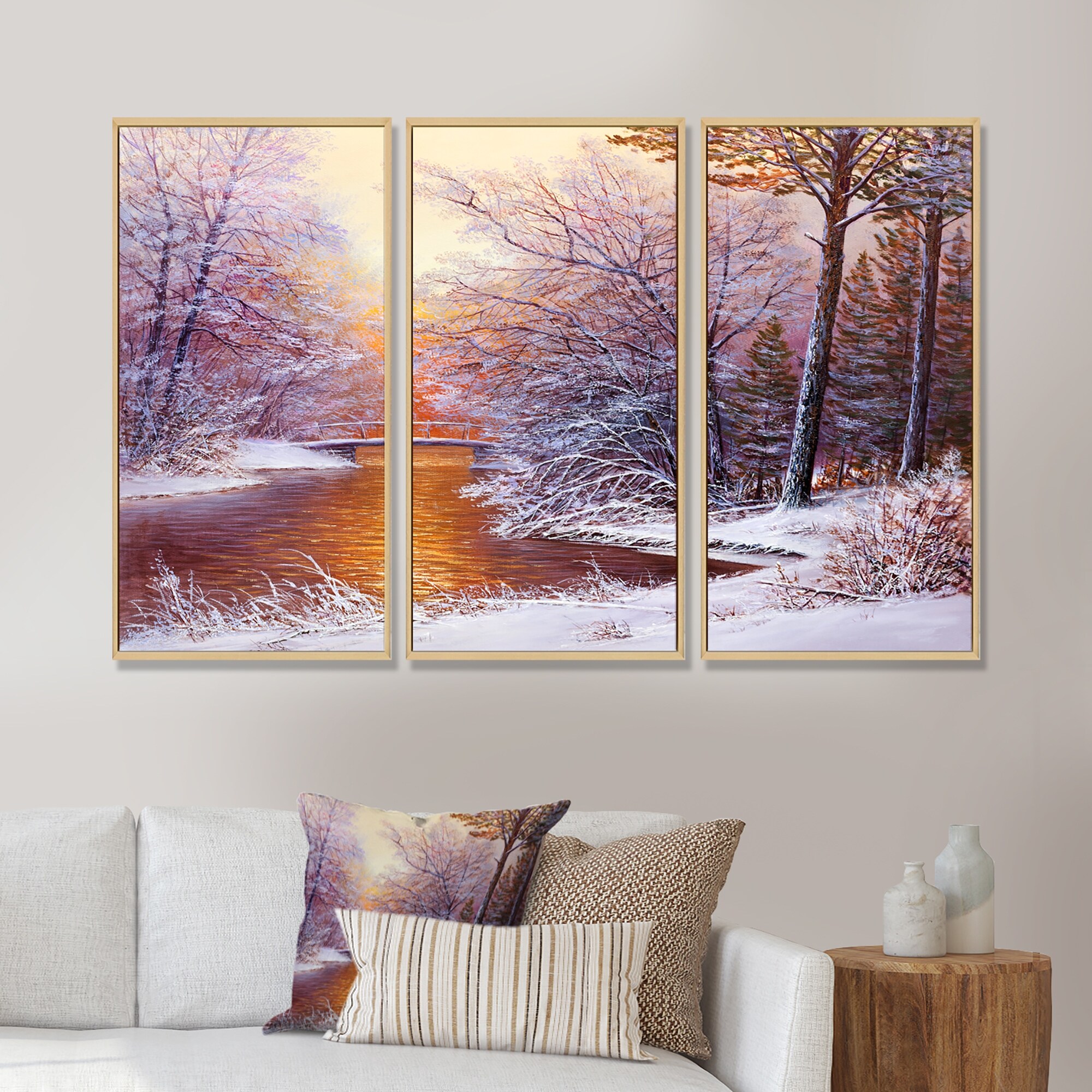 Designart "River in Winter" Landscape Framed Canvas Wall Art Print Set of 3 - 4 Colors of Frames
