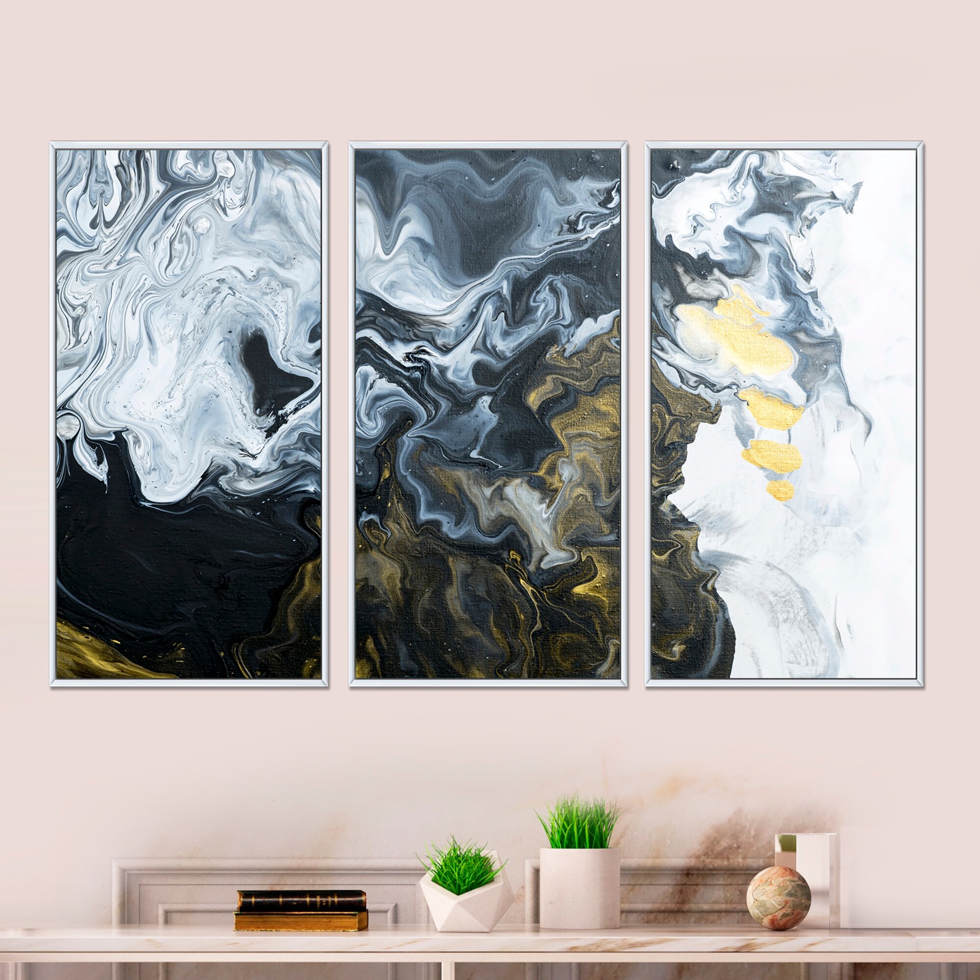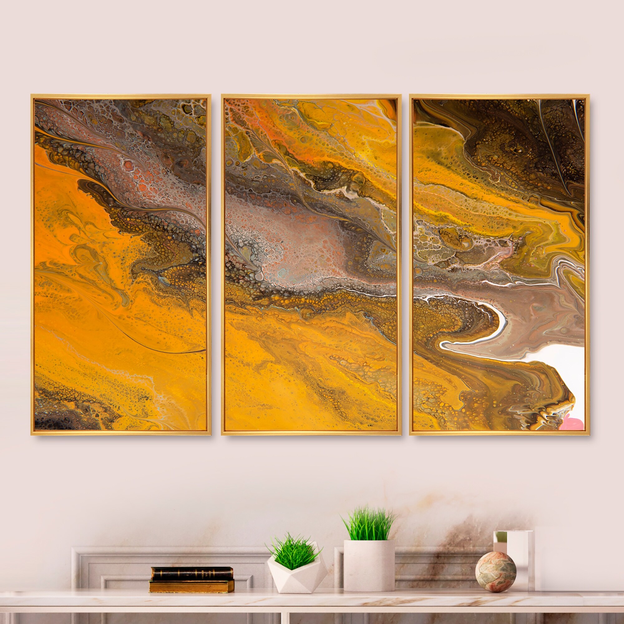 Designart "Yellow Marble River in Liquid Art Universe IV" Modern Framed Wall Art Set of 3 - 4 Colors of Frames