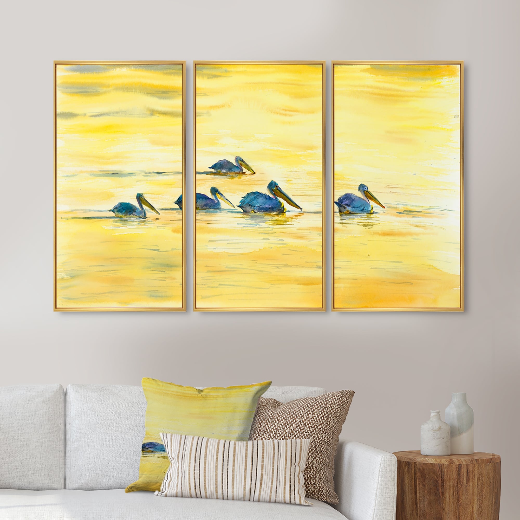 Designart "Pelicans On the Yellow River" Farmhouse Framed Artwork Set of 3 - 4 Colors of Frames