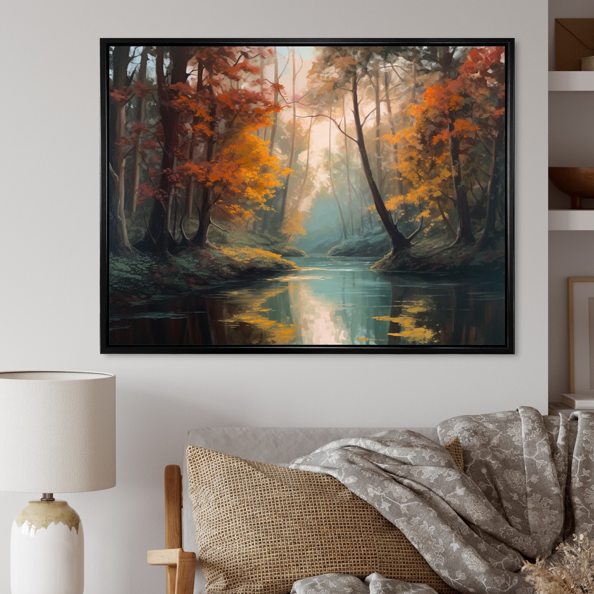 Designart "Picturesque Autumn Forest By the River" Traditional Framed Art Set of 3 - 4 Colors of Frames