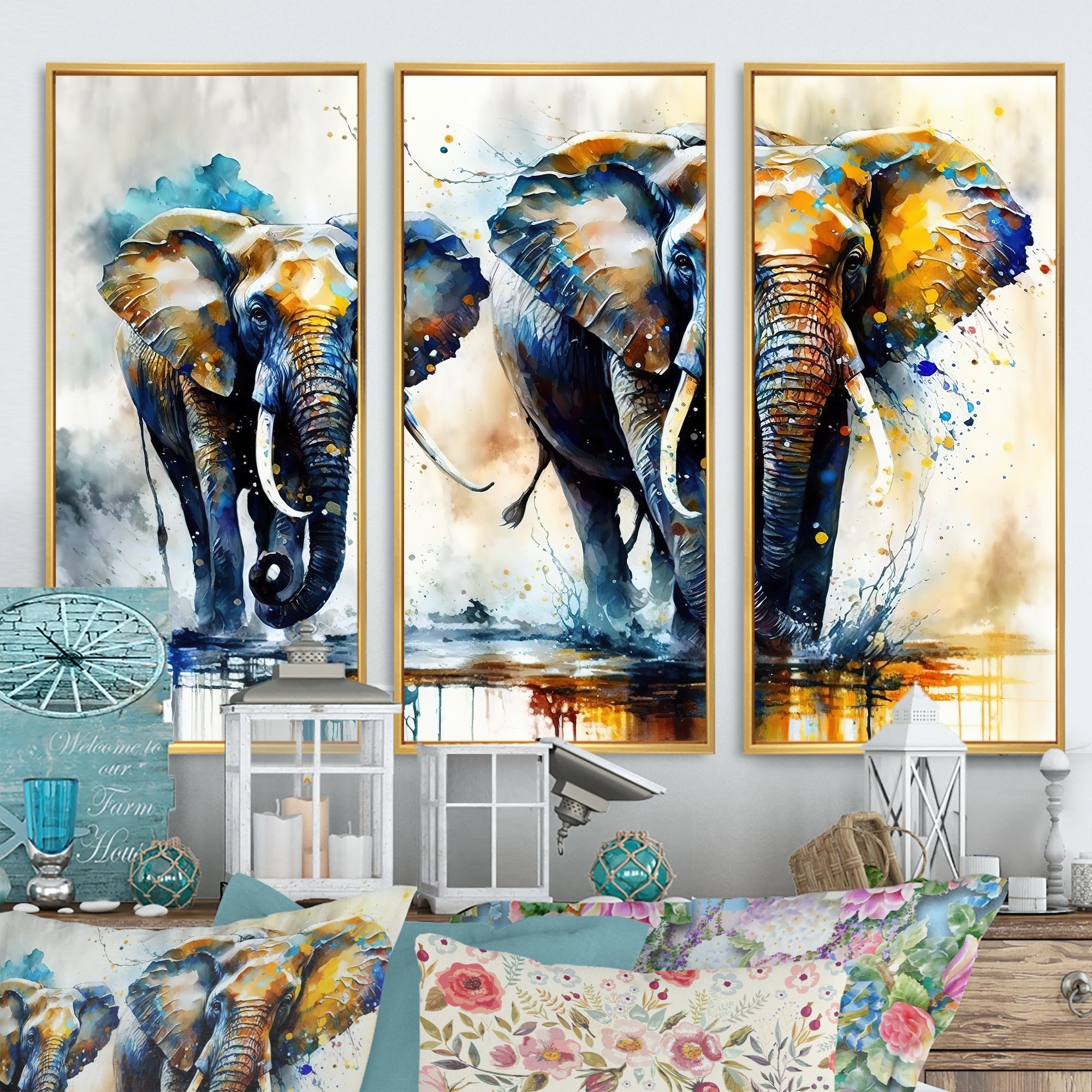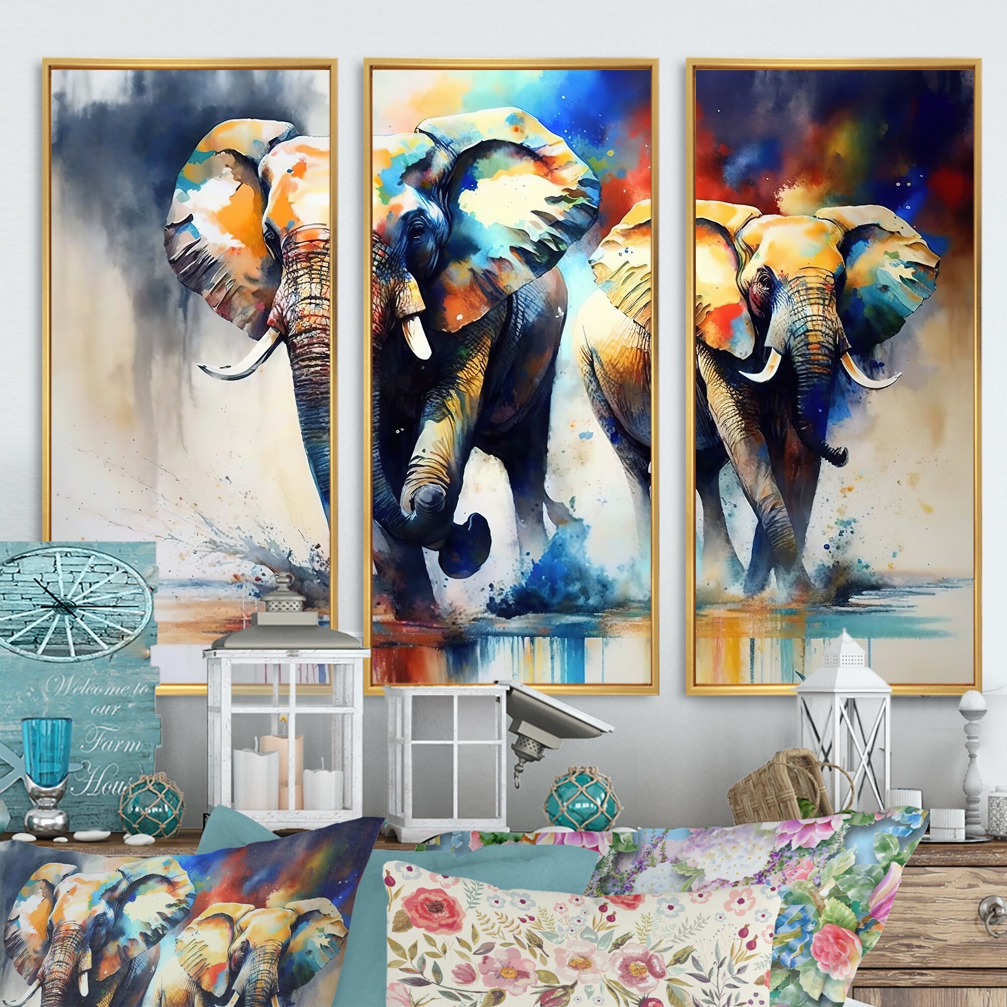 Designart "Elephants Running II" Animals Elephant Framed Canvas Art Print - 3 Panels