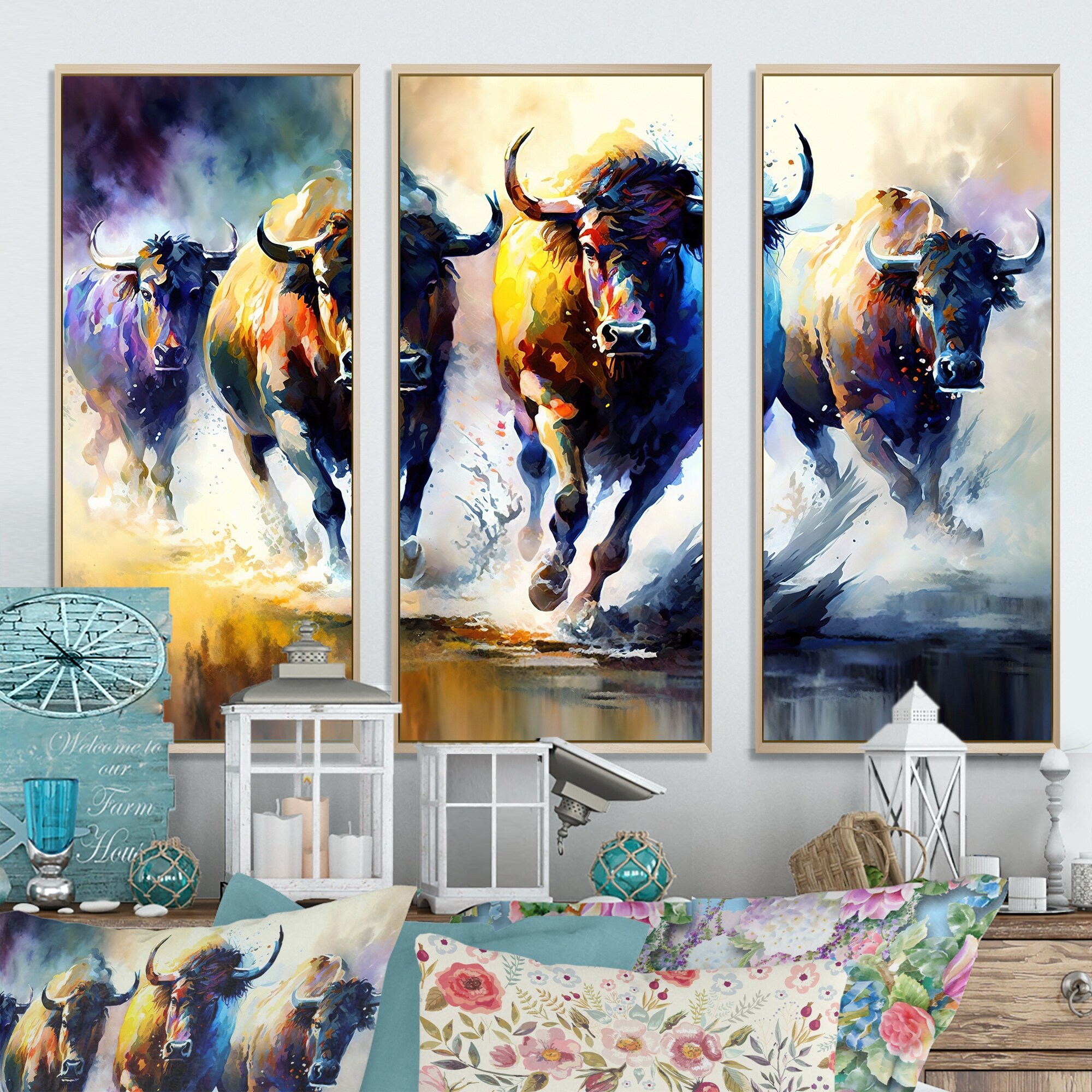 Designart "Cows Running I" Animals Cow Canvas Art Print - 3 Panels
