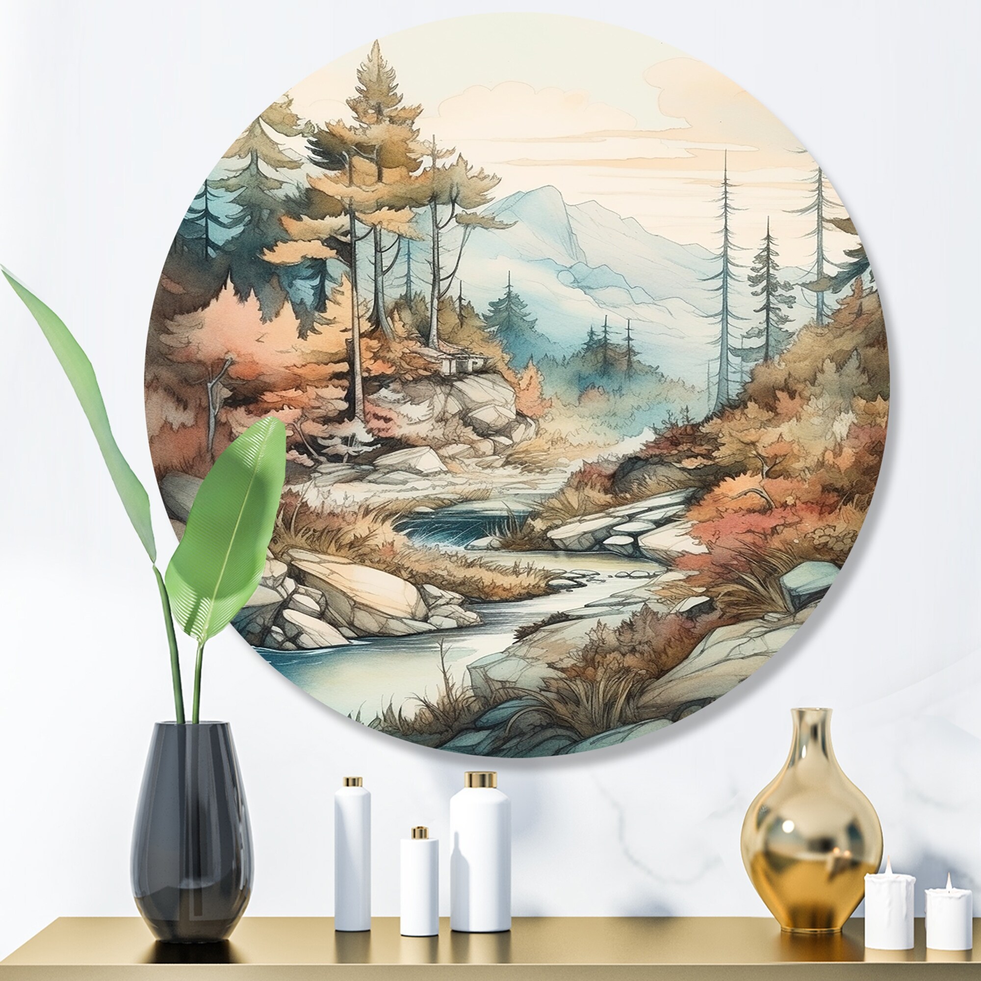 Designart "Stream Running Through the Mountains" Landscape Mountains Lake Metal Round Wall Art
