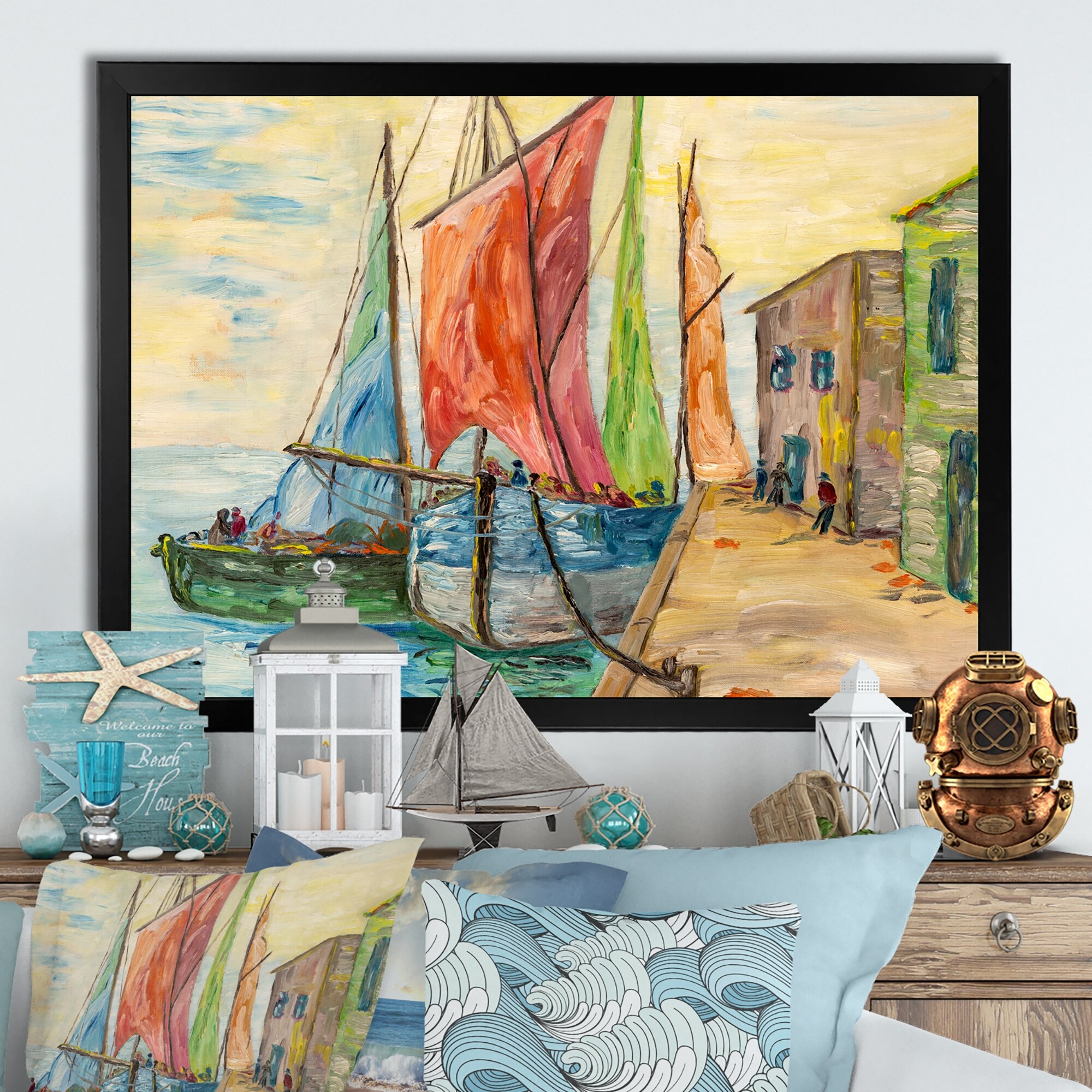Designart "Yellow And Red Sailboats in the Harbor" Nautical & Coastal Framed Canvas Wall Art