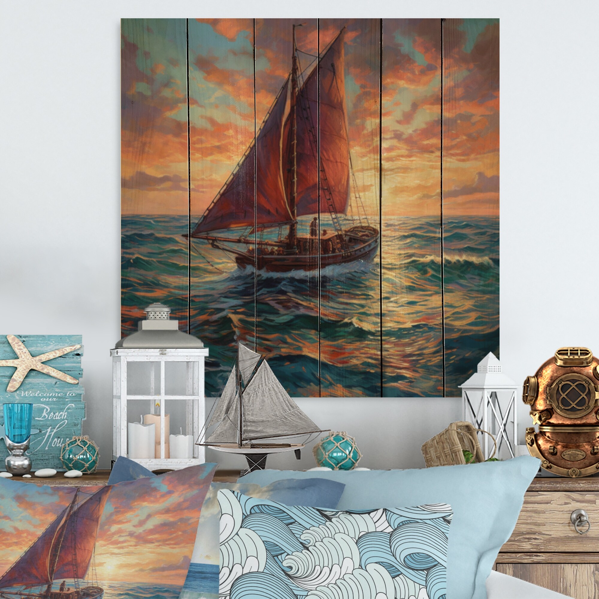 Designart "Sailboat At Sea II" Modern Landscape Beach Print on Natural Pine Wood