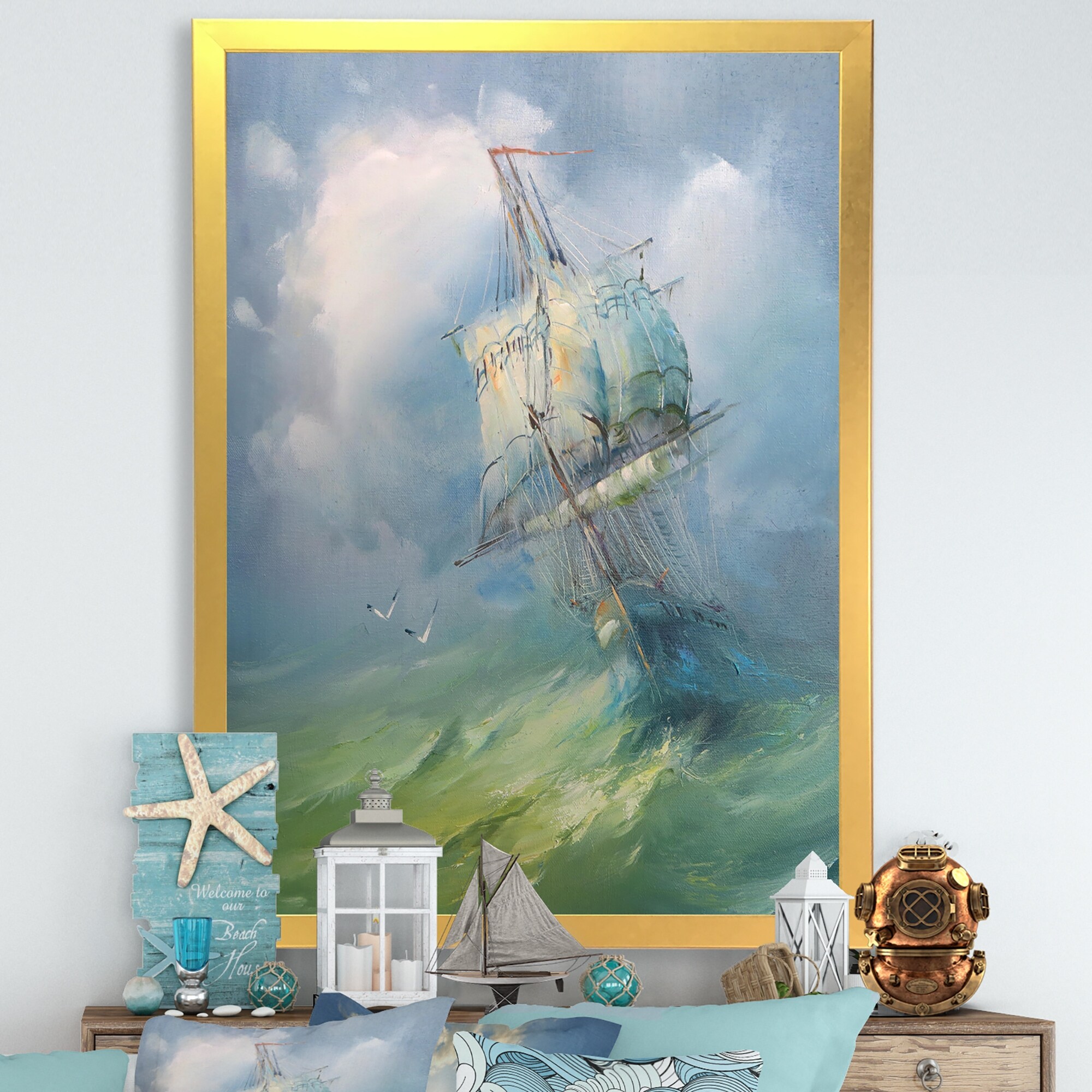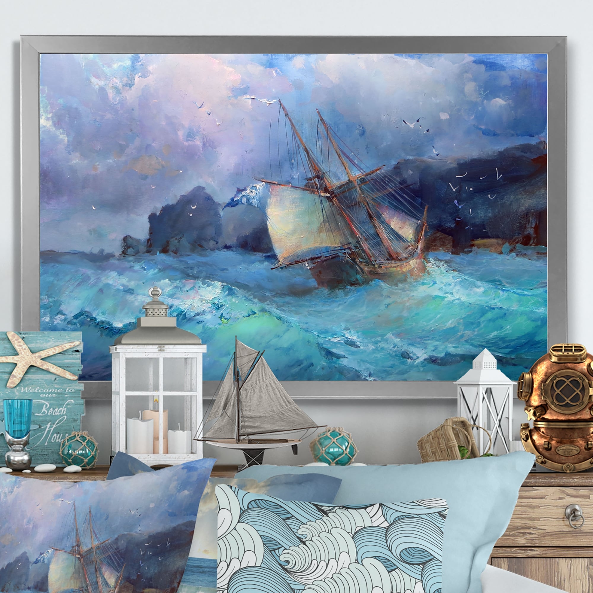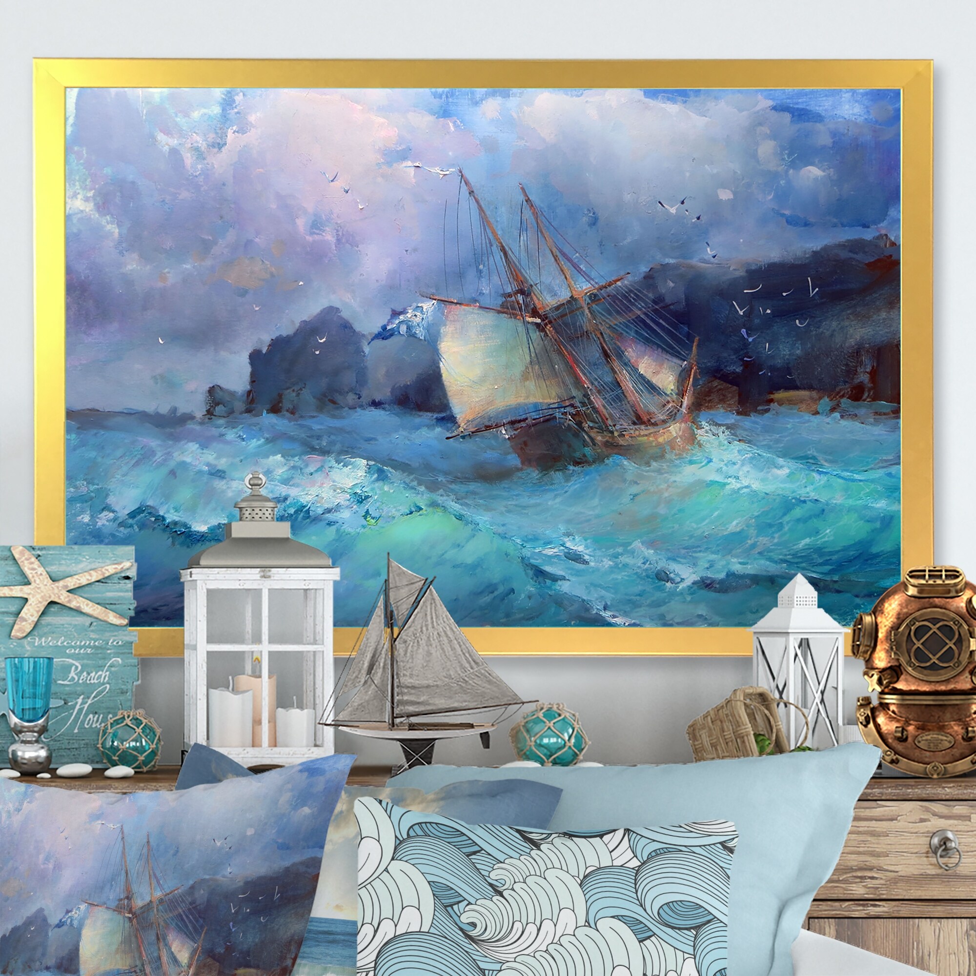 Designart "Old Colonial Sailboat in Storm" Nautical & Coastal Framed Wall Decor